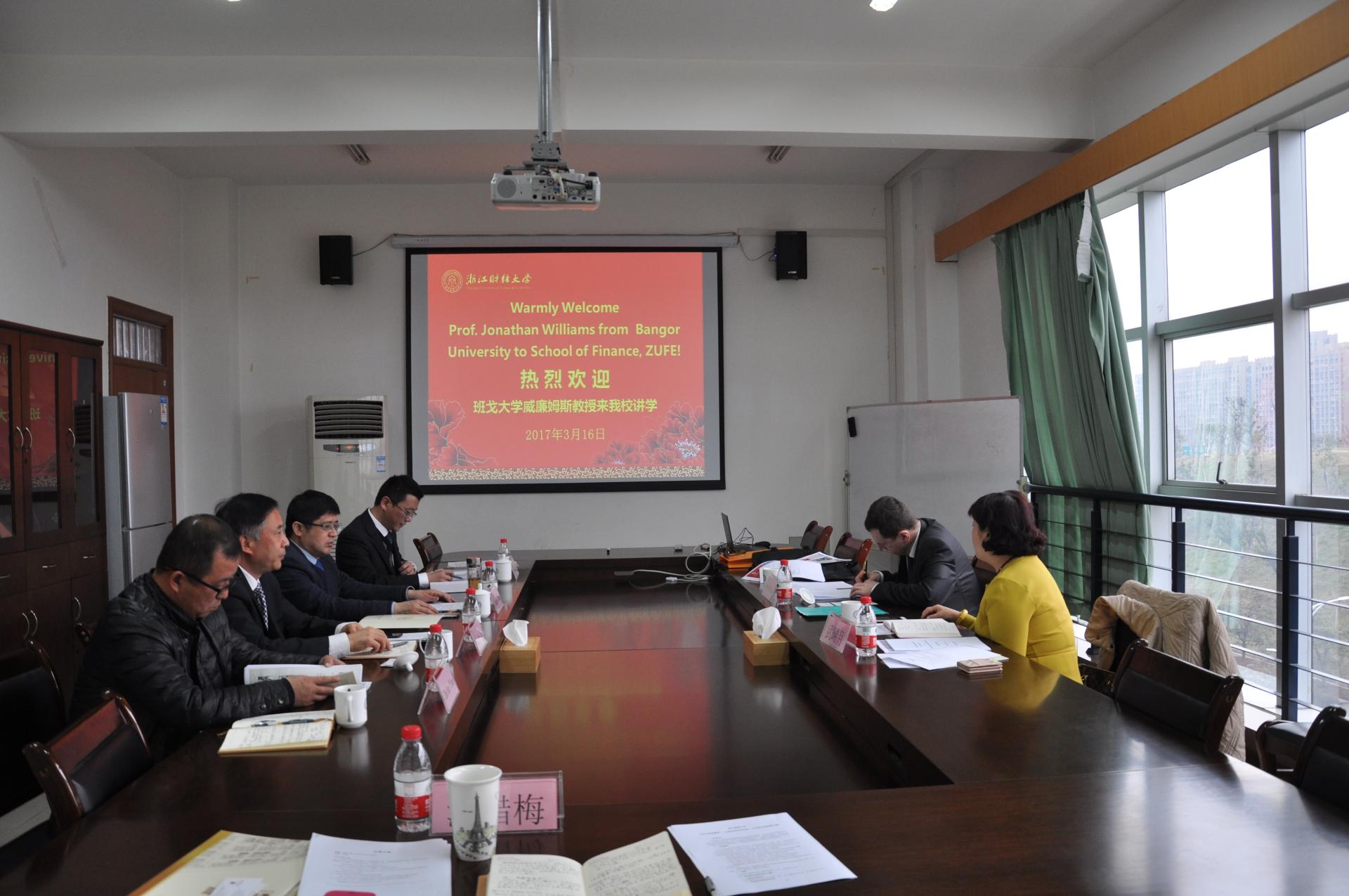 陈荣达院长、蔡国金书记、王聪聪副院长、朴哲范副院长就金融学中英合作项目的现状与发展等方面进行了会晤。会上探讨了项目培养方案的修订、英方师资支持以及我方学生去班戈大学留学的对接等问题。