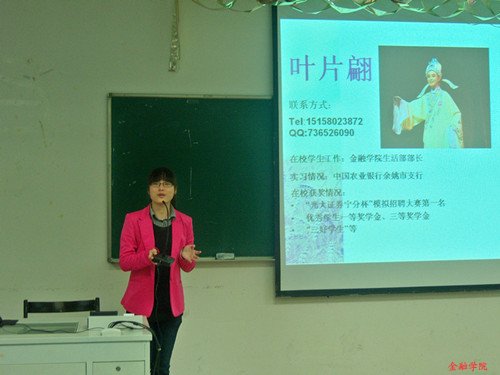 前生活部部长叶片翩学姐,她主要为大家讲解了求职的基本流程。叶片翩学姐认为,保持良好、乐观的心态,有时刻自信的态度,坚持明确的目标是面试中获得考官青睐的三大要素。“做最好的自己。”这句话不仅给学姐在跌宕起伏的求职之路带去了动力,也给在座的金融学子带来了正能量。
