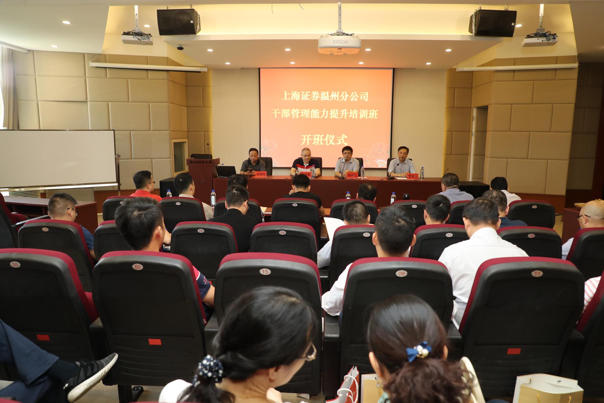 楼二楼学术报告厅隆重举行开班仪式。开班仪式由蔡国金书记主持,陈荣达院长、上海证券温州分公司蔡晓敏总经理等出席本次会议,上海证券温州分公司营业部负责人等管理干部近30人参加了开班仪式。