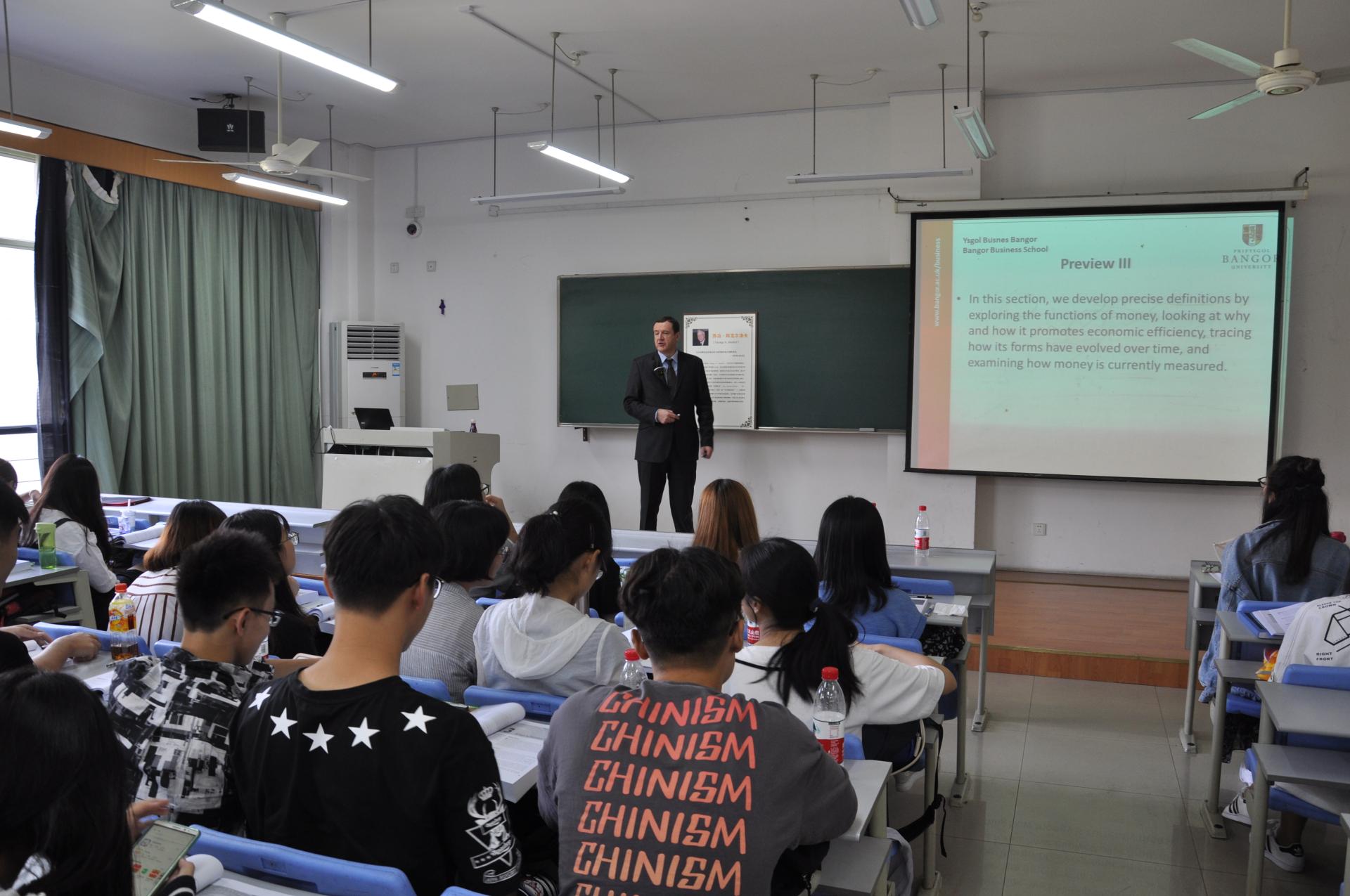 与班戈大学联合办学的中英项目合作班的学生授课,课程名称为《Financial Markets and Institutions》,授课内容主要包括金融体系及其构成,金融市场及其产品定价,金融机构内部管理原则以及金融监管发展趋势,中央银行和货币政策实施等。此次班戈大学商博彩代理