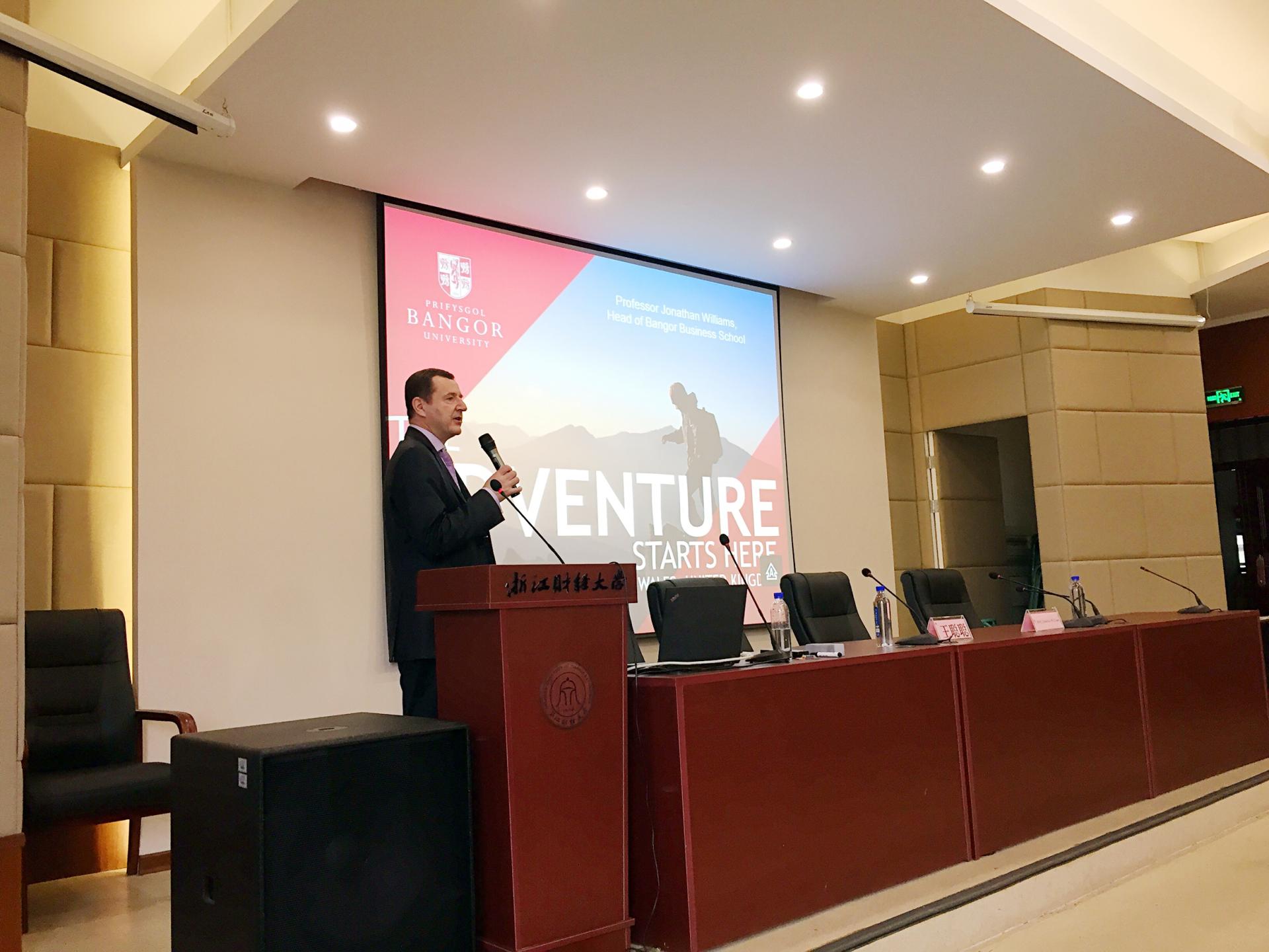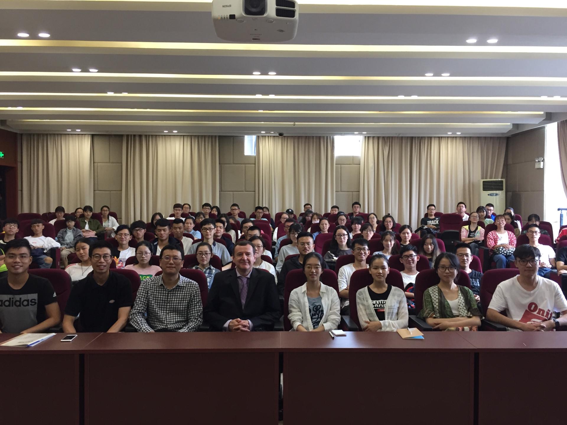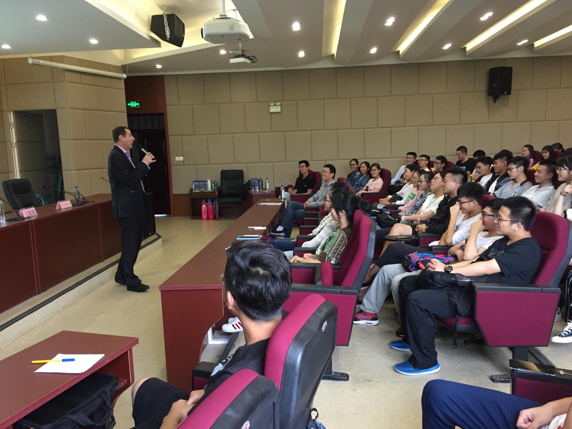 Jonathan Williams教授细致又不乏幽默地为新生们介绍了班戈大学悠久的历史、国际化的教学环境、美丽的风光,接着教授阐述了博彩代理 与英国班戈大学合作办学项目对于中英金融学专业学生在国际化、专业化的重大意义。最后,新生们与教授进行了详细的交流。