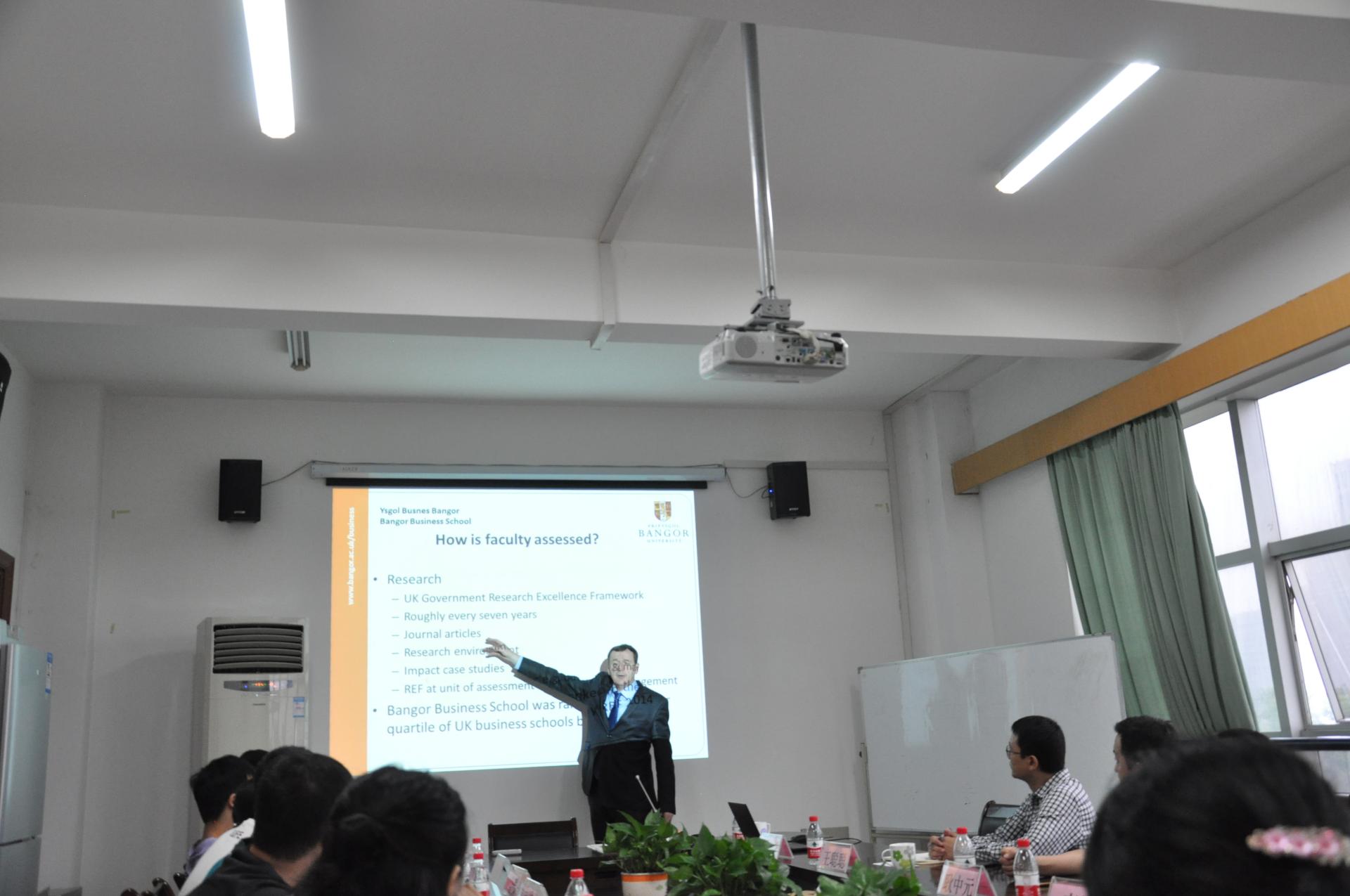 做了简短的介绍,随后围绕教学、科研及行政工作进行了详细的阐述。威廉姆斯教授指出,教学与科研是大学教师工作中不可缺少的一部分,同时提供了一些评价教学与科研绩效的标准方法。他强调了合作在科学研究中的重要性,并通过一些现实生动的例子表明他的观点。针对青年教师比较关心的如何平衡教学、科研与行政工作,他分享了一些自身的经历与看法。最后,威廉姆斯教授同与会教师进行了充分交流,与会教师反响热烈,纷纷表示获益良多,希望与班戈大学进一步加强交流与合作。