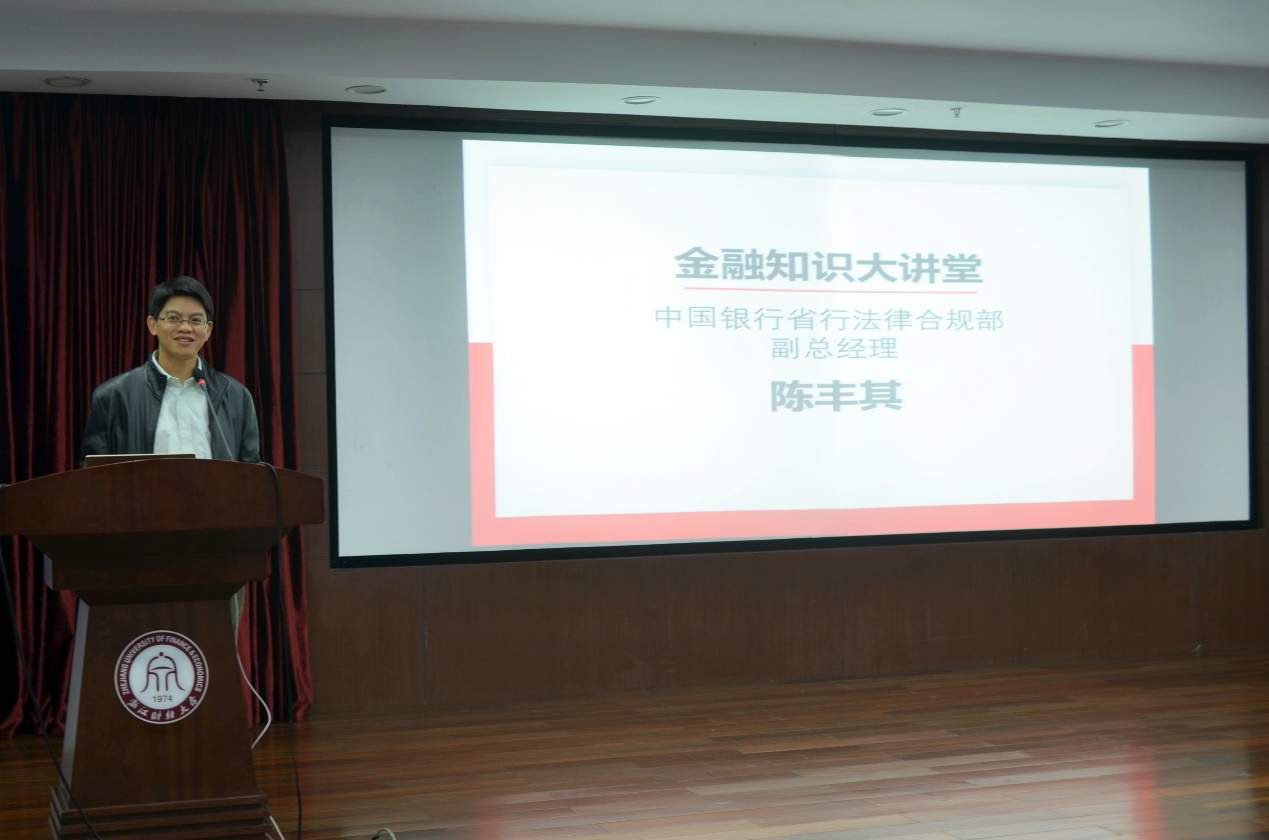 最后的“金融知识进校园”环节由中国银行省行法律合规部副总经理陈丰其先生为广大学子分享金融风险防范知识,介绍了“校园贷”、“金融传销”在校园大学生中的危害,分析了“国际制裁”、“反洗钱”等国际时事热点问题,该堂生动的金融知识讲座让在场学生受益良多,反响热烈。