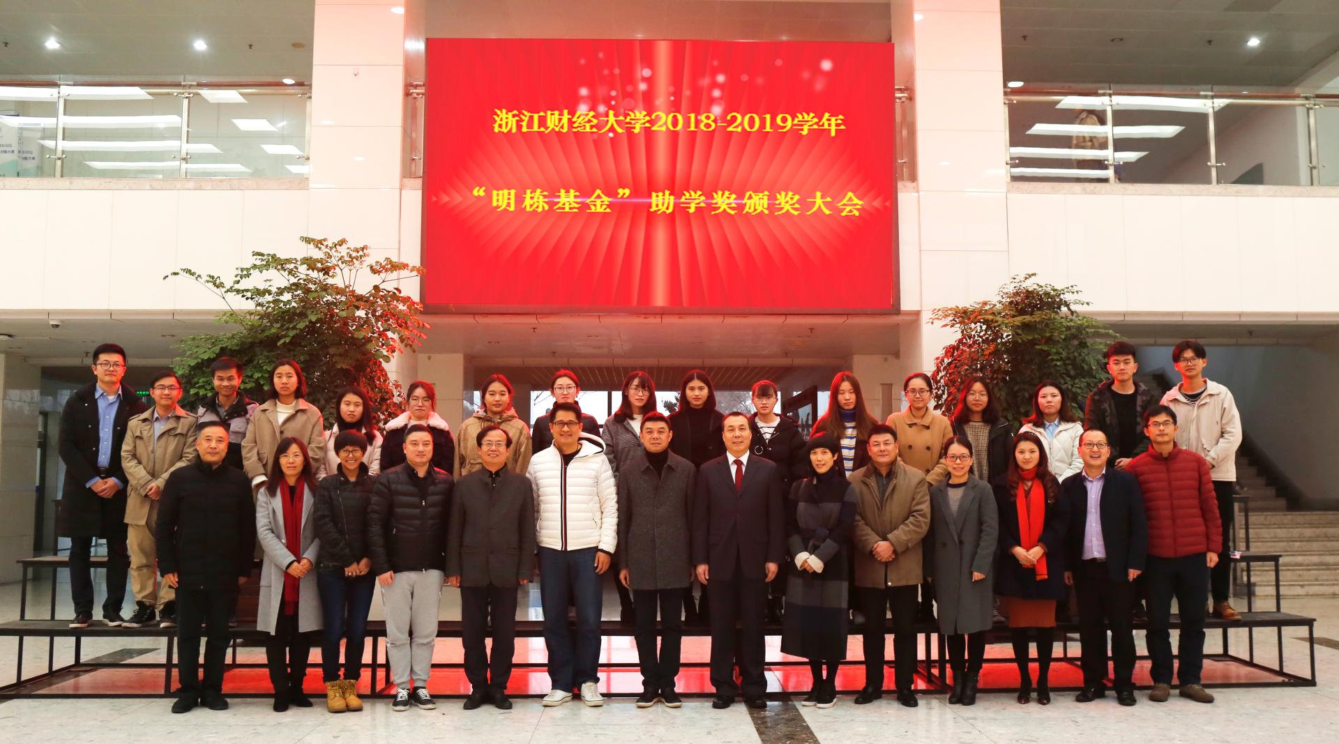 12月20日下午,2018-2019学年“明栋基金”助学奖颁奖大会再度在下沙校区举行。校党委书记李金昌、校党委副书记黄建新、蓝山投资有限公司董事长王晓明、浙江盈阳资产管理股份有限公司创始人楼栋、蓝山投资有限公司总裁王柳琳、浙江盈阳资产管理股份有限公司总经理孔繁岗、关瑞慈善基金会执行会长吕霞、博彩代理