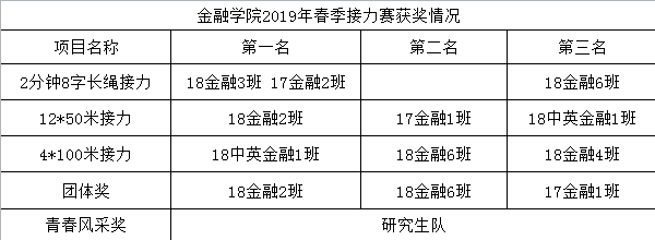 最终的团体总分前三名为18金融2班、18金融6班、17金融1班。这次的接力赛一方面锻炼了同学们的团结意识和拼搏精神,增强了班团支部的凝聚力;另一方面也让学生提升了综合素质,做到了德智体美劳全面发展。