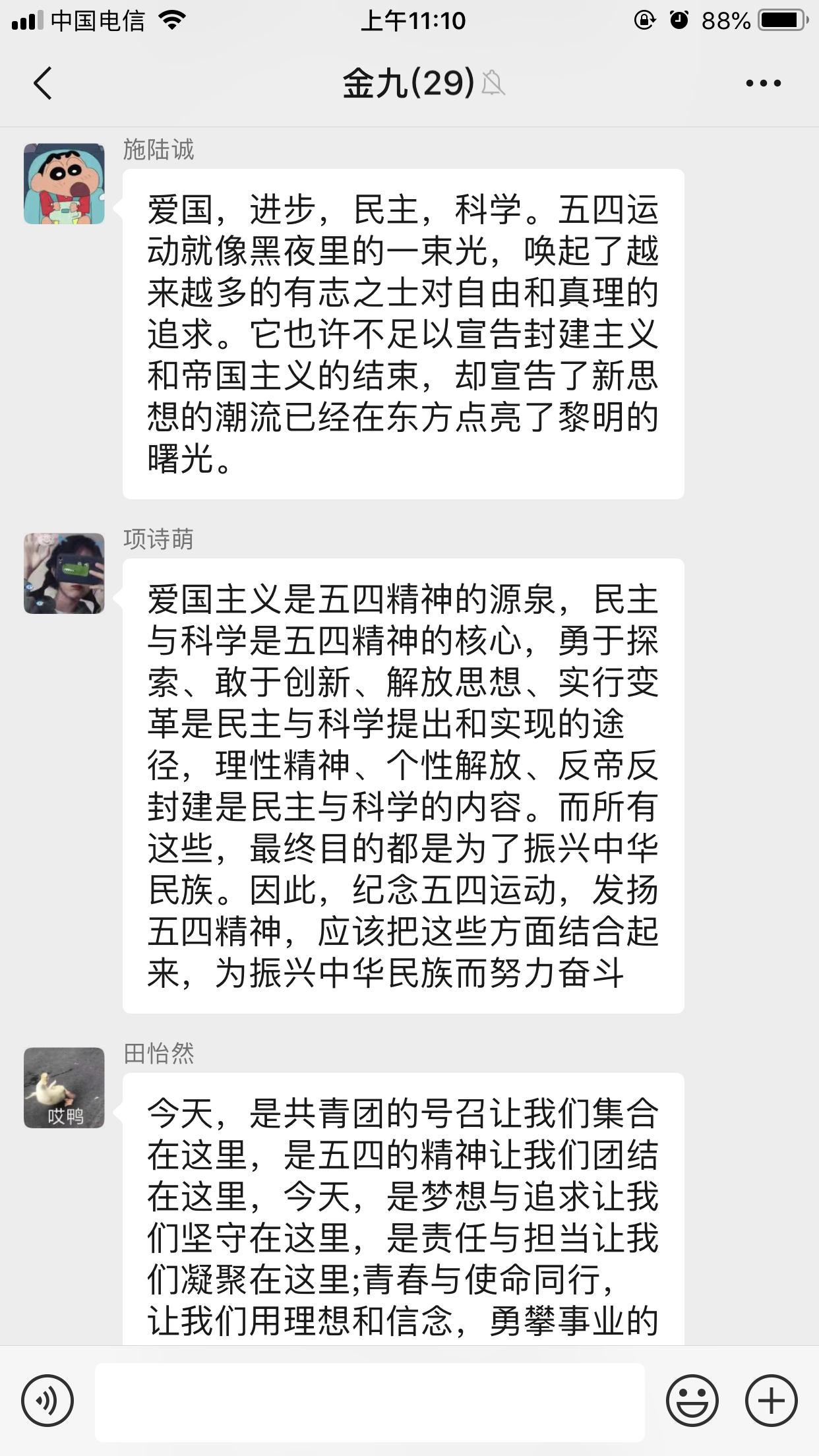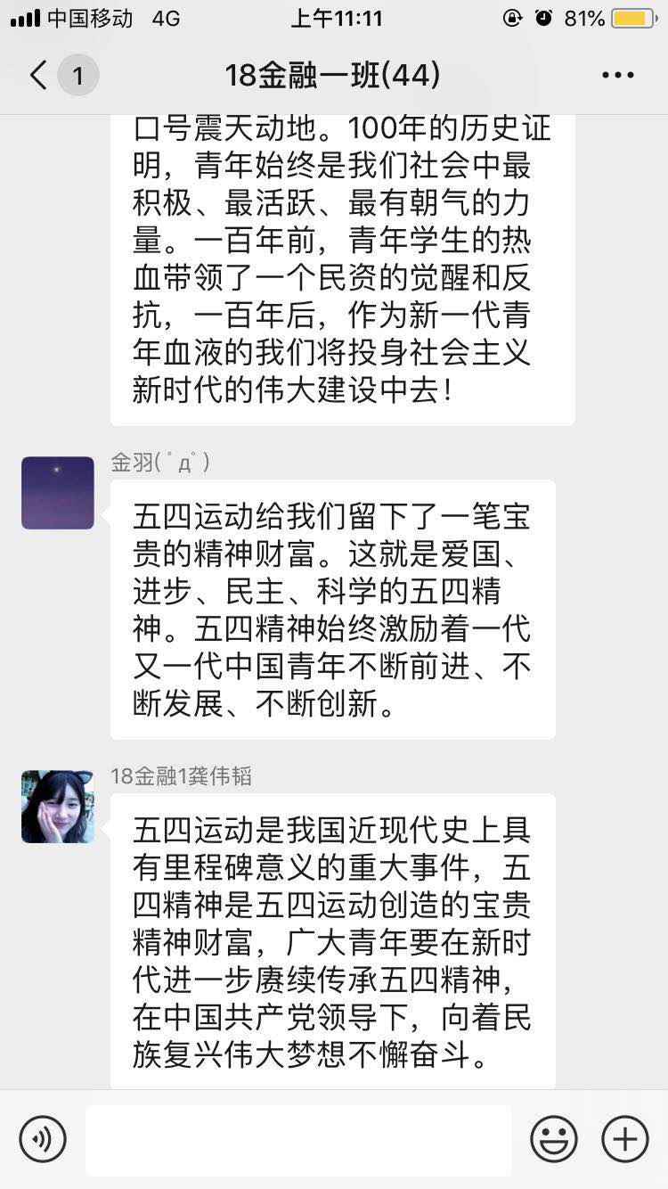 16金融国际班团支书宫雨婷说,可能没有哪个符号比“五四”这个词对年轻人更有感召力和触动力了,提起这个词,我们内心都会涌动出一股热烈的青春情怀,因为这个词里有历史,有热血,有无论你到了什么年龄都会感受到的青春基因和民族记忆。每到这个日子,我们都会想起那段关系国家命运转折的大历史,想起那场波澜壮阔激荡人心的爱国运动。作为如今的青年学子,我们要珍惜生活,砥砺前行,终有一天我们年华老去,青春不再的时候,会因我们曾奉献过自己的力量而没有丝毫遗憾。