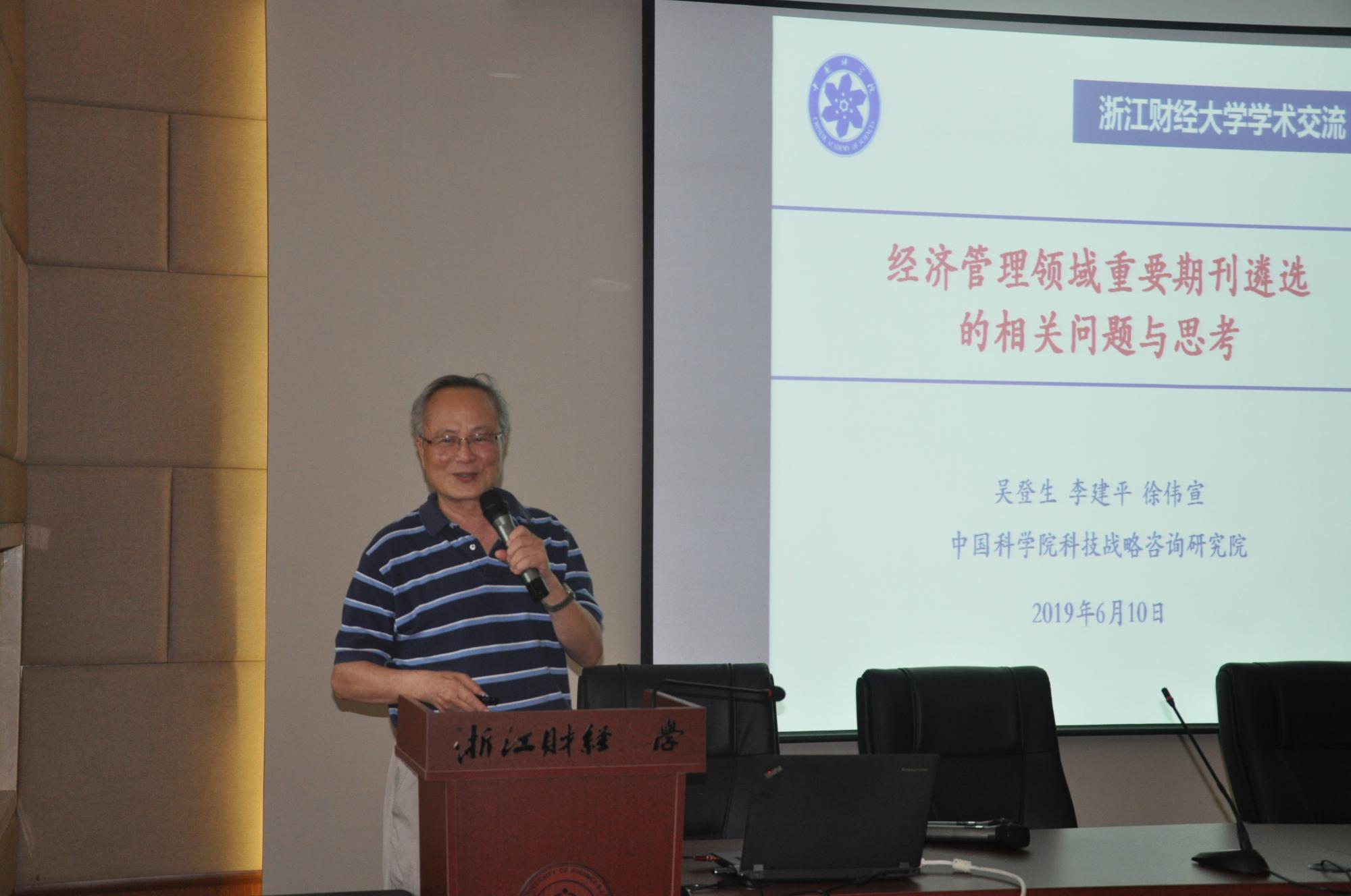 徐伟宣教授作了题为“经济管理领域重要期刊遴选的相关问题与思考”的学术报告。针对当前期刊分类乱象问题,提出三大技术难点,即现有定量指标不能准确反映期刊质量,国内经管院校期刊列表一致性和认可度不高,国际经济管理重要期刊列表存在区域偏好。