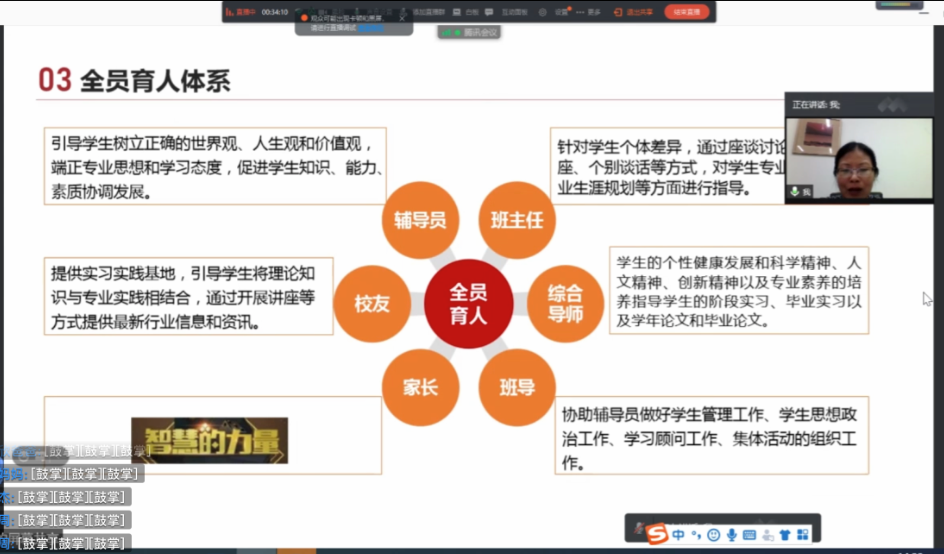 积极贯彻“全员育人”的教育理念,辅导员、班主任、综合导师、家长、班导、校友在学生健康成长中均发挥了重要作用。她还介绍了博彩代理