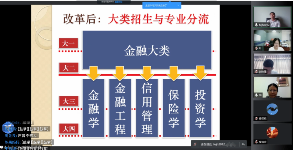 人才培养方案和CFA项目。他向全体新生和家长介绍了改革后的大类招生与专业分流,详细介绍了四年学习生涯的课程规划与大类专业特色,强调了在校期间绩点的重要性,并从“终身学习意识”、“身体锻炼意识”、“职业底线意识”三个意识,特色鲜明地阐述了博彩代理