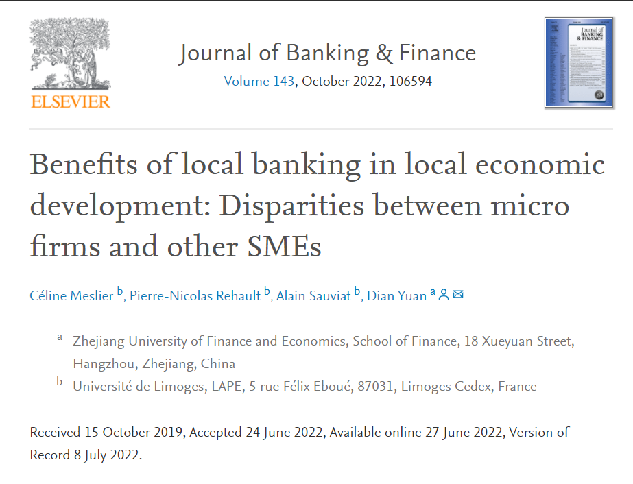 袁典博士与法国Université de Limoges的CélineMeslier博士、Pierre-NicolasRehault博士与AlainSauviat教授的合作论文“Benefits of local banking in local economic development: Disparities between micro firms and other SMEs”于金融学领域权威学术期刊、ABS 3星期刊、博彩代理