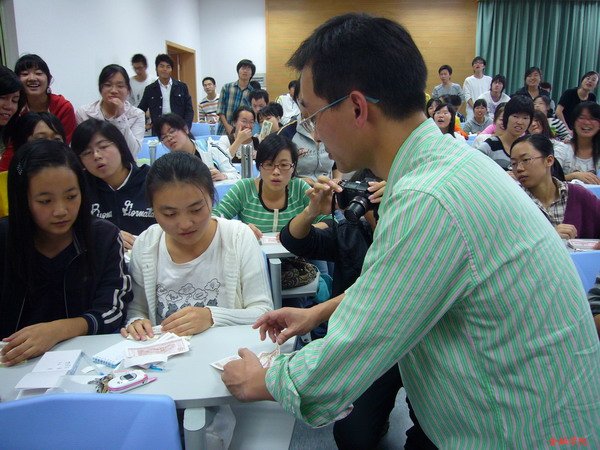 但在丁老师手中看似简单的动作,一到同学们手里就不那么简单了。丁老师在教室的各个角落不停地作着示范,他娴熟的指法,飞快的速度,自如的神态,让同学们无一不为之折服。培训持续了两个多小时,最后在同学们热烈的掌声中圆满结束。
