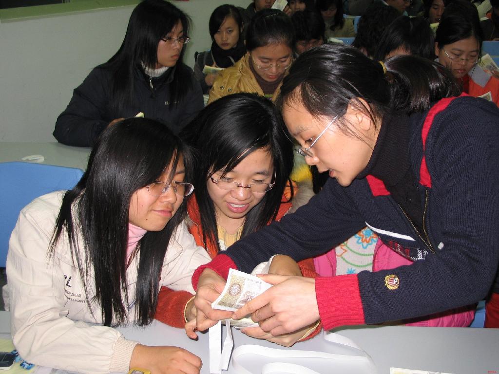 本次讲座形式新颖,气氛活跃。傅老师和吴老师以自身丰富的经验细心地为同学们讲解了银行操作的基本原理,并且现场演示点钞技能。在场同学们都热情地参与其中,大家手持一叠“练功券”,像模像样地效仿娴熟银行职员的工作方式动手点钞。傅老师讲解细致、操作专业,她不时地走进学生当中,耐心地示范点钞的姿势与捆钞的方法。经过一个多小时的培训,一些开始还对这些“钞票”手足无措的同学,俨然已是一个有多年工作经验的老银行家了!