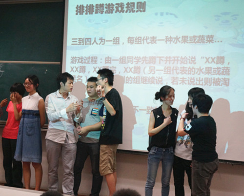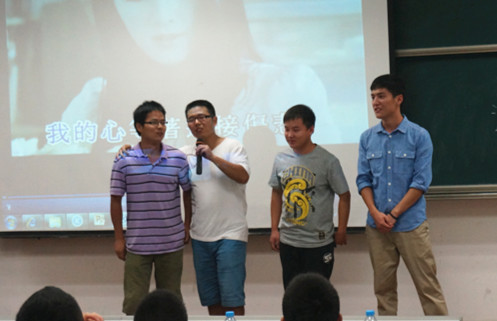 在交流会伊始,由张全达、 周运金、李昂、章寒冰、钱川、汪君毅、施娴勤、孙前冬等8名研一研二学生共同演唱了一首《情歌王》。台上的同学深情歌唱,台下的同学齐声轻和,现场气氛迅速火热起来。