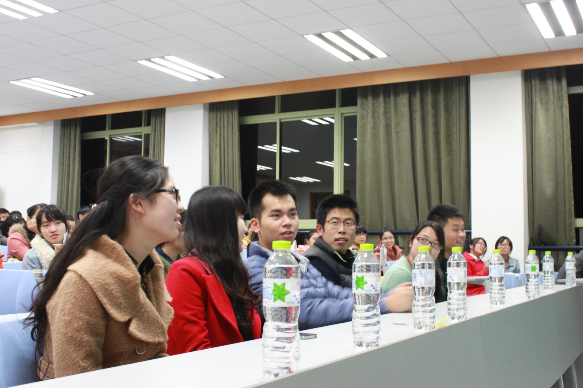 接下来各位选手开始了他们的朗诵。每位选手都来自不同地域不同风格的高中,他们用各具特色的方式向自己的母校传达了感恩、喜爱、怀念之情。深情的声音响彻于教室,同学都被这氛围所触动。在选手朗诵期间,比赛还穿插了“我爱记歌词”和“我为母校拉人气”两个调节气氛的小游戏,同学们参与其中欢笑不断。比赛中选手们尽情发挥,风格各异,其中的几位更是给大家留下了深刻的印象。如13金融三班的徐金菊用自己创作的动人诗篇歌颂了自己的母校嘉兴高级中学,“成长在南湖之滨,迎接新世界的曙光,嘉高人永远求真,嘉高人博学厚德”;又如来自13信管的鲍泓瑾,以独特的幻灯片展示,新颖而幽默的演讲,以及许许多多的旧照片带领我们与他一同走入对贵阳一中的回忆之门。经过激烈的评比,四强终于诞生。他们分别是:徐金菊、林宗怡、鲍泓瑾、宗澜。之后同学们用自己的一元钱选票选出了最后的冠军:鲍泓瑾。在评委上台为四位选手颁奖并合影留念之后,活动也走向了尾声。