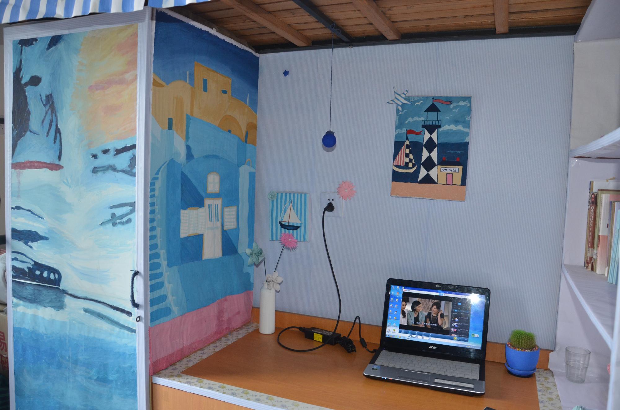 在走访过程中,参赛选手们都热心积极地为前来考核的同学讲解他们布置寝室的设计理念。他们别具匠心的装饰、独树一帜的风格让评选同学们眼前一亮,有典雅恬淡的欧式风格,清新自然的日式风格,靓丽唯美的韩式风格……其中最吸引人眼球的要属15幢420寝室的地中海风格布置。唯美的蓝色纱幔、朴素的淡蓝色墙纸、点缀在天花板上的深蓝色群星、造型美观的壁挂渔网,还有寝室成员们亲手绘制、美丽精致的蓝色油画,使得整片空间浑然一体,充满着地中海浪漫自然的异域风情,受到评委们的一致好评。值得注意的是,本次比赛在评选寝室时,除了寝室装扮的美观度,也非常注重学生们在装扮寝室过程中所用材料是否环保,装饰是否自制,创意是否新颖,坚决反对铺张浪费的装饰方式,提倡学生亲手制作既有创意又美观大方的寝室装扮。