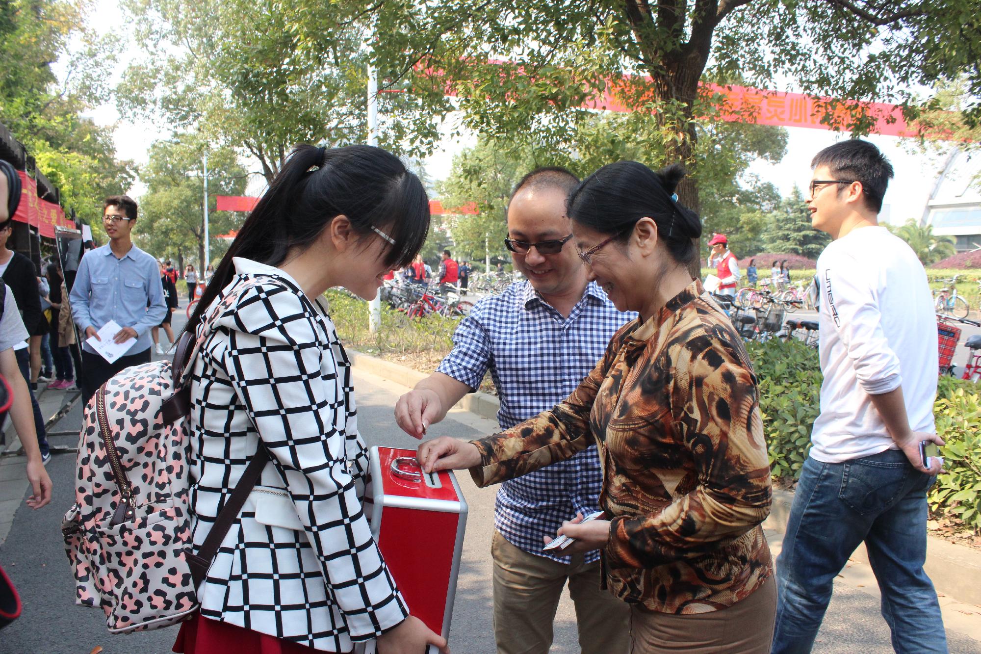活力四射的开场舞吸引了过路同学们的眼光,也为本次的一元钱活动拉开了序幕。一旁的文化长廊下便活动的主场——研途风景、职来职往、倾情义拍、书香画韵四个板块。 “‘研’途风景”和“职来职往”两个板块为贫苦毕业生提供丰富的考研资料和面试正装。“倾情义拍”则是是由信管学会主持的“金石拍卖会”,“书香画韵”则是义卖下沙二小小朋友的绘画作品及大一新生书法大赛获奖作品,活动所得款项将资助给大四班困难生,为他们求职、考研提供帮助。在活动过程中,信管学会还举行一次拍卖为一元钱活动筹集善款,拍卖现场一片欢乐和谐的氛围,竞价声此起彼伏。一件件爱心拍品也顺利地找到了各自的归宿。另一边,吉祥物的投票选举也是人群紧簇,热闹非凡。