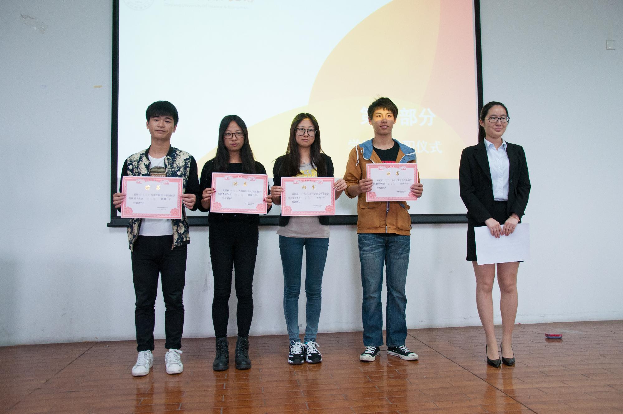 在主持人隆重地介绍出席会议的嘉宾之后,学生会就职仪式正式开始。作为本次大会的主要部分,仪式在有序、热烈的氛围中开展。首先,在一片掌声中,前办公室部长为主席团成员颁发聘用证书,这也代表着作为主席的他们正式开启了学生会工作的新篇章。接着各部门部长和副部也纷纷接受了各自的聘用证书。接过证书,部长们依次发表了自己的就职感想和对部门发展的期望,部门成员们欢欣鼓舞、反响热烈。而在今后的一年任期里,接过证书的他们不仅要证明自己名副其实,更要把肩上承担的责任转化为动力付诸于工作当中。授聘书环节结束后,学生会主席李梦璇带领学生会全体成员进行宣誓,高高举起的拳头和激励人心的宣誓词明确了所有成员在学生会的目标,也坚定所有人为学生会付出的信念。