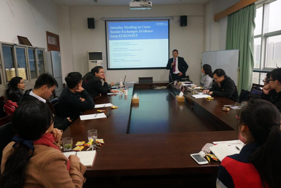 13日下午,作为工作坊的另外一项重要内容,双方举行了学术论文交流,共有四篇论文在会上进行研讨,分别是:(1)Board leadership structure and firm performance - A meta-analysis (Dr. Mei Yu);(2)Executive Pay Disparity and Internal Control Material Weaknesses (Dr.Zhu Hui);(3)Intraday herding on a cross-border exchange (Dr. Panagiotis Andrikopoulos);(4)Effects of the Interest Rates on Bank Credit Risk:Empirical Evidence from China (Dr.Zhongyuan Geng)。研讨会采用国际学术会议范式,论文作者进行简短介绍后,在座老师和同学就论文中的数据、观点、理论逻辑提出质疑,进行讨论,作者进行现场解答。
