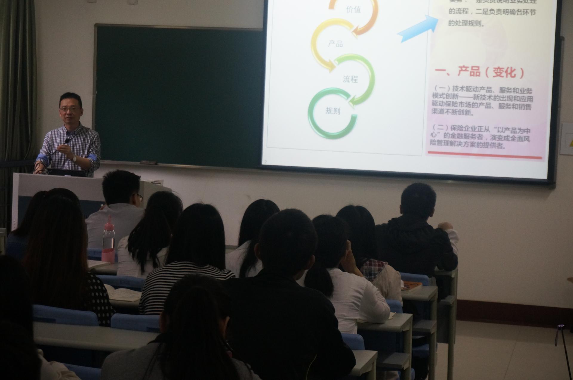 《保险学》课堂为同学们作了 “保险公司销售与理赔—产品、流程、规则、价值”的专题讲座。不同于我们从教科书上所学的理论知识,胡先生以机动车辆保险承保与理赔为出发点,通过各种翔实的案例与资料,向同学们全方位的展示了互联网时代大数据的应用对财产保险实务带来的巨大变革,以及由此引发的对现有保险理论的重新思考和跟进研究。同学们全神贯注地聆听,并与胡岱磊先生进行了互动提问,课堂气氛活跃。类似于基地精英进入进课堂的方式,无异于对同学们开拓眼界、了解教材之外的实务知识、加深课堂理论知识的掌握、提高同学们专业课学习兴趣都有着极大的帮助。