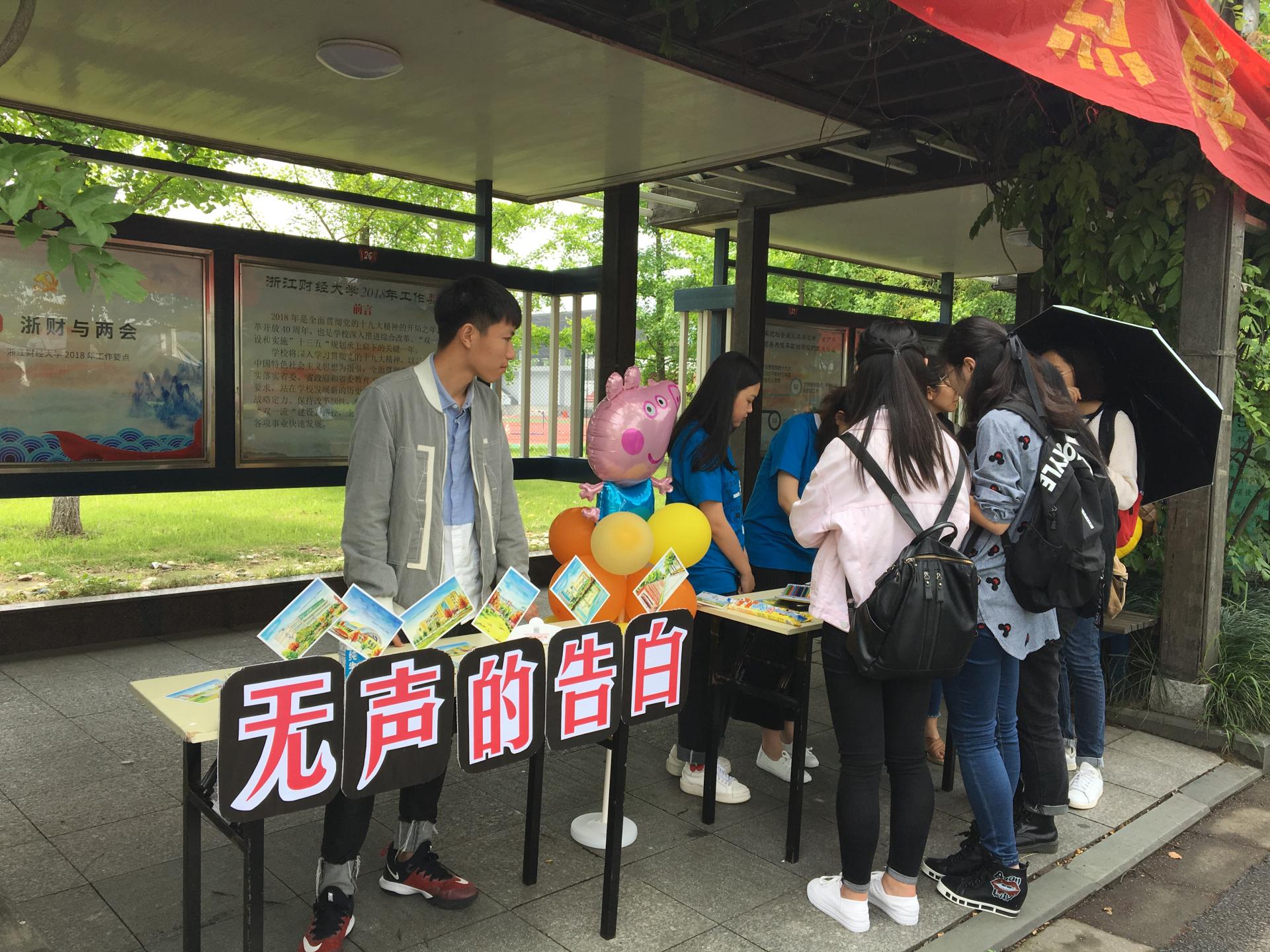 在文化长廊熙熙攘攘的人群中,穿着红马甲、蓝体恤的志愿者们形成了一道亮丽的风景线。炎热的天气阻挡不了他们乐于奉献的心,志愿者们总是保持耐心并礼貌地为路过的同学介绍此次活动,并详细地解答他们的疑惑。
