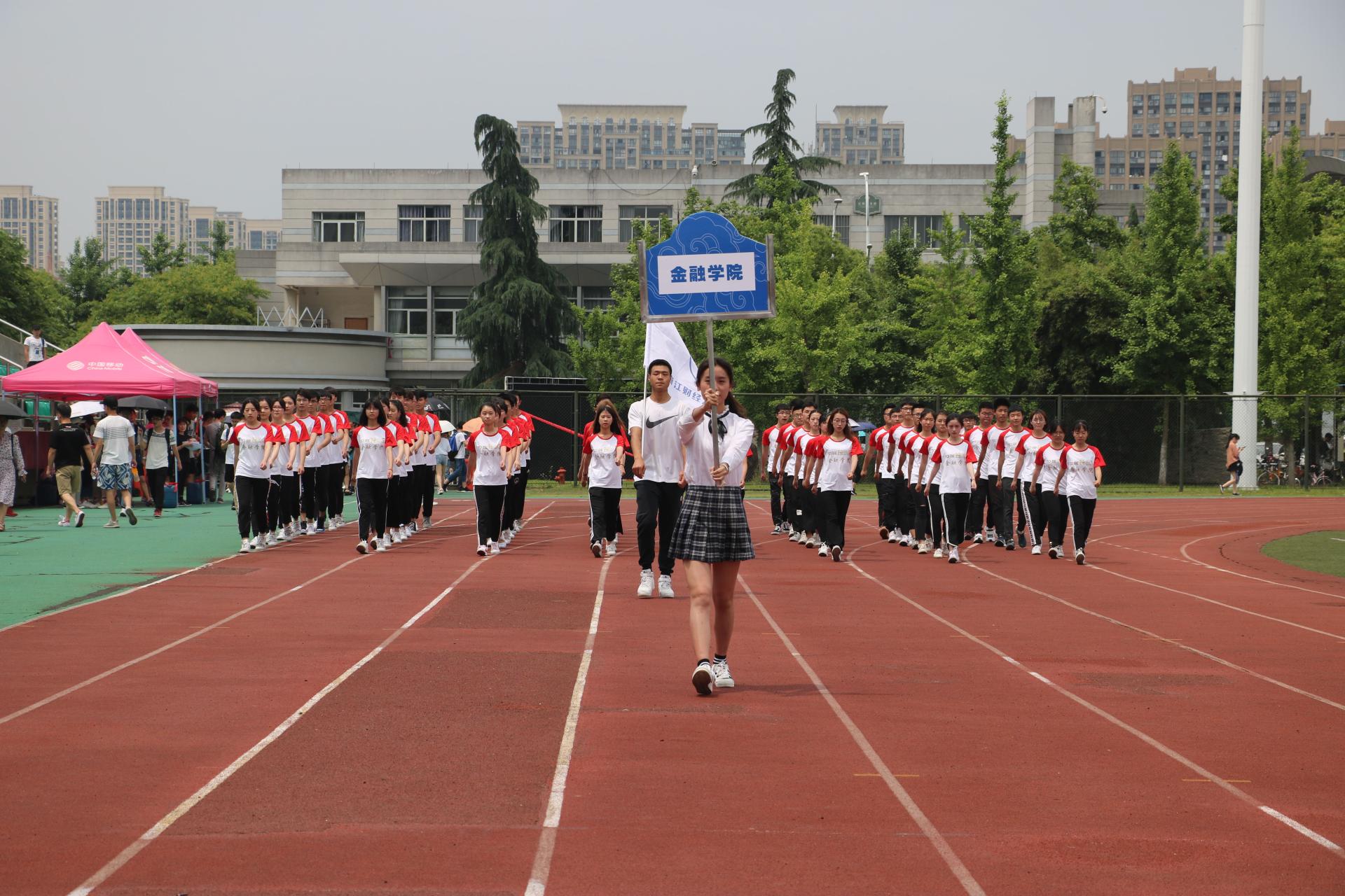 方阵精神抖擞,迈着整齐的步伐、喊着响亮的口号入场,一套军体拳尽显金融学子的磅礴气势。