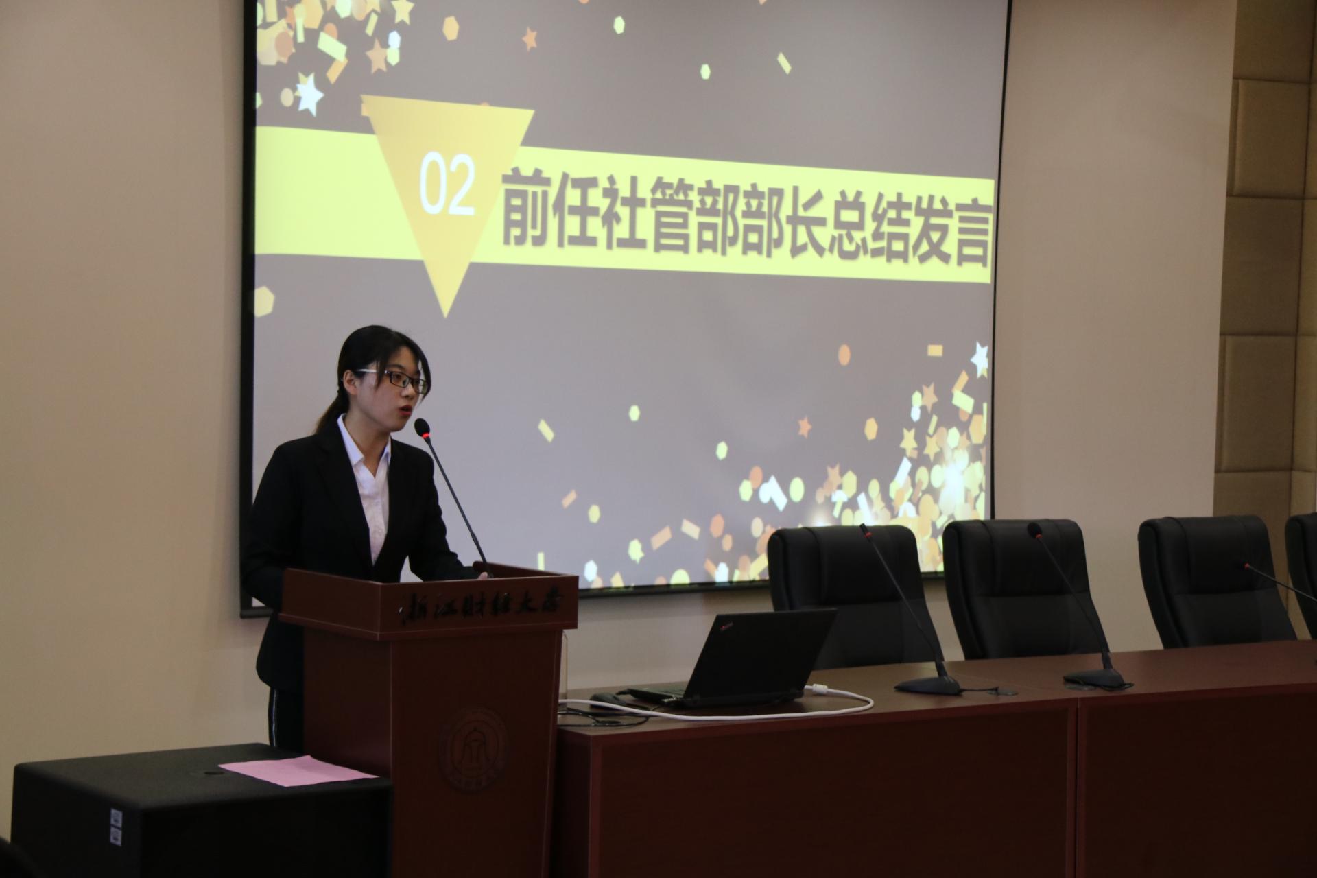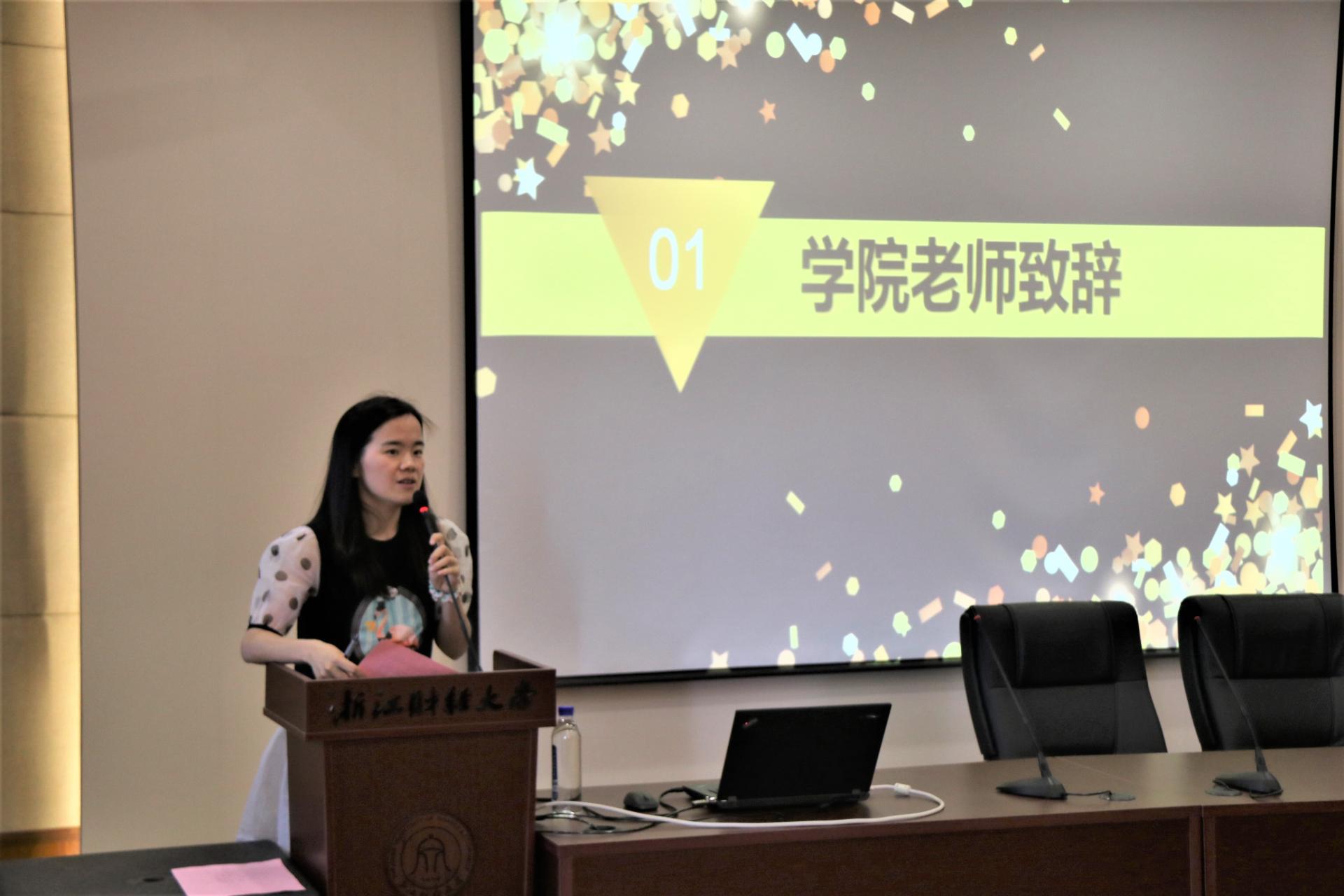 翟丽媛老师首先发表讲话,她对各社团在学科竞赛、学术研究与学风建设上做出的贡献表示肯定,对 “APEC”峰会进行了总结分析,并对各社团提出了期望:希望各社团发挥各自学术优势,不断创新,蓬勃发展。