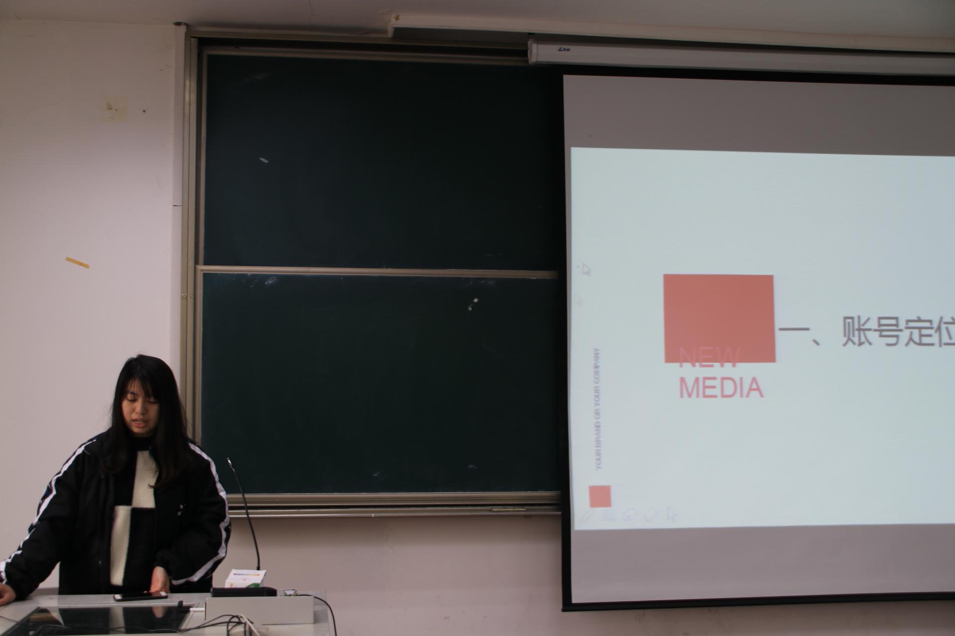 沈琛媛同学就账号定位分析与文案编辑进行了讲解,她从账号性质、账号受众、账号形象、账号内容四个方面详细而生动地分享了玩转新媒体的经验与建议。接着,她为大家讲解了玩转新媒体需要注意的经验与建议,并向同学们展示了大量成功创新的案例。
