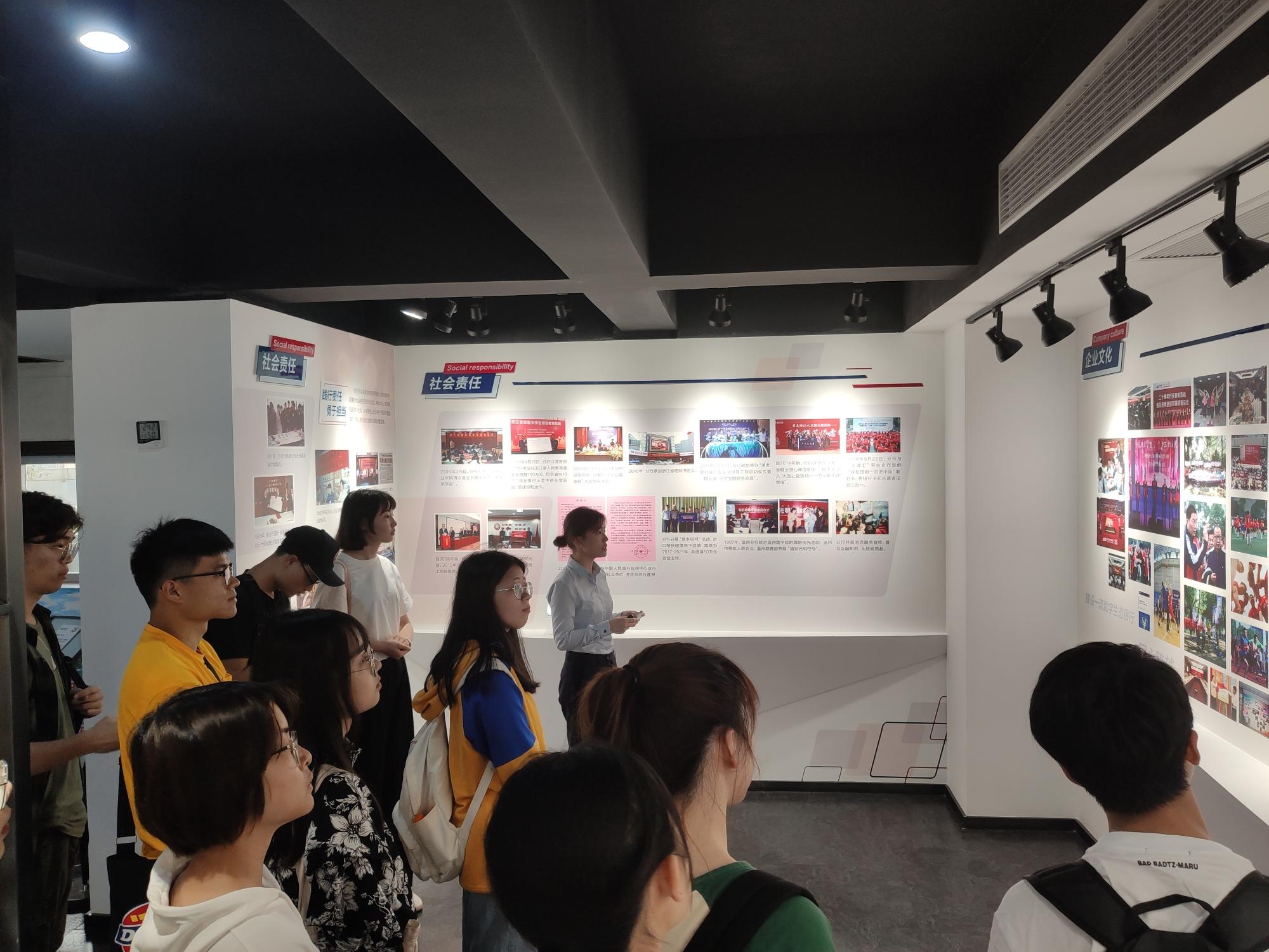 浦发银行理财经理刘安妮先带领同学们参观了浦发银行杭州分行行史馆,介绍了企业的发展历史、党建工作、社会责任及博彩代理等相关内容。