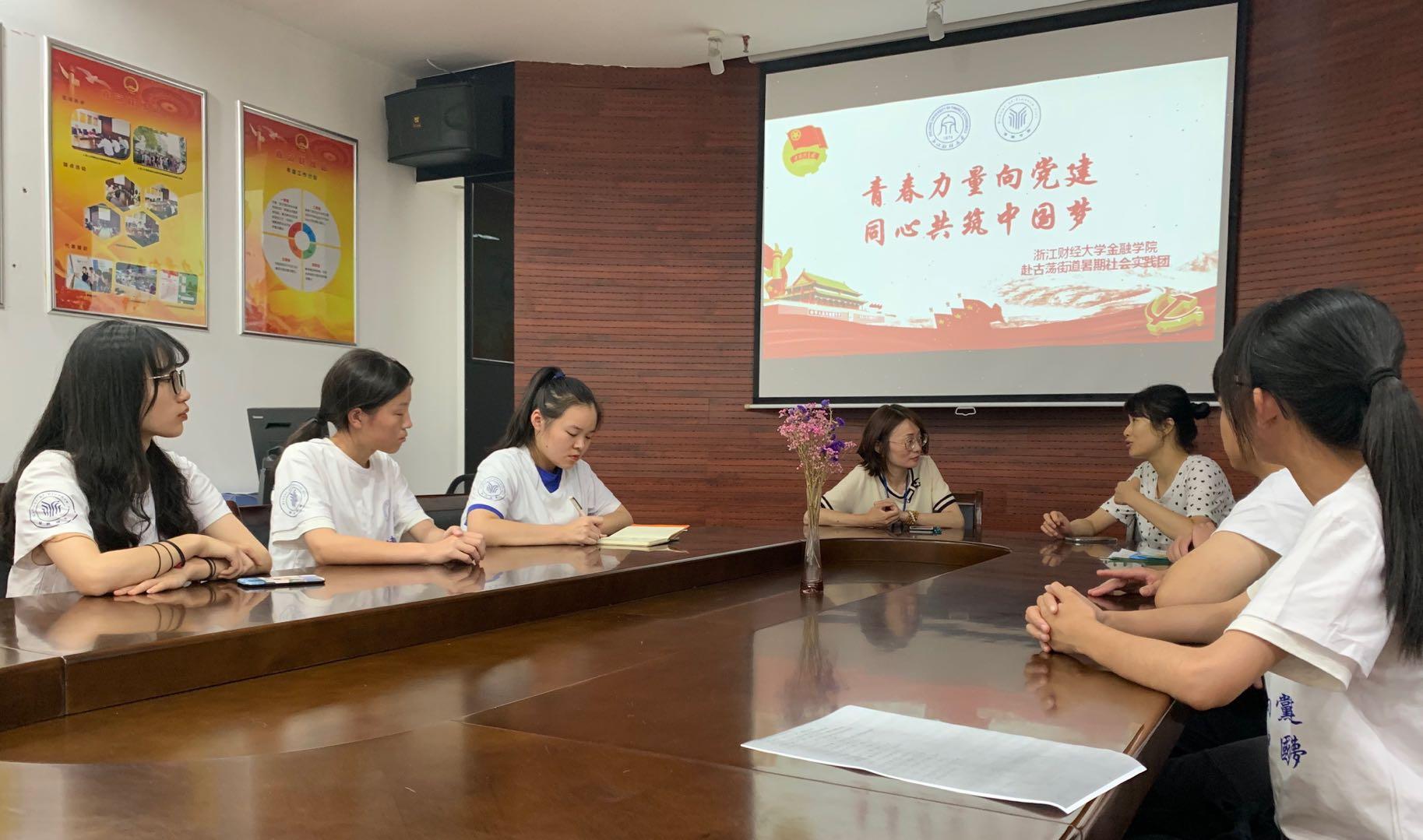 7月9日,“青春力量向党建,同心共筑中国梦”暑期社会实践团在吴轶韵老师的带领下,来到古荡街道嘉荷社区党群服务中心和古荡街道莲花商务圈楼宇社区党群服务中心,就当地的基层党建相关工作进行调研了解。