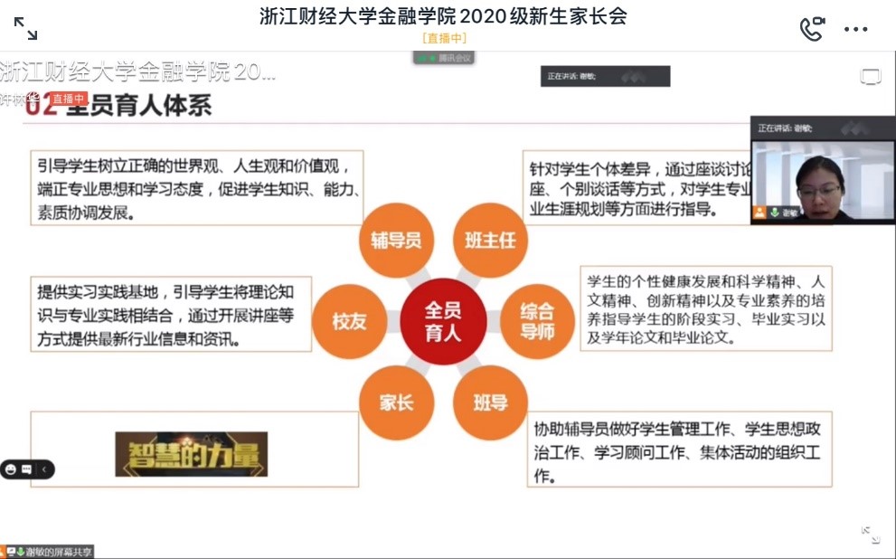 2020级新生的生源背景,并对获得“双财奖学金”的同学表示了祝贺。她鼓励同学们积极参与第二第三课堂,全面提升竞争力,为争取更高的目标而努力。最后,谢敏副书记还贴心地从新生适应问题、学业问题、心理问题、诚信问题、安全问题几个方面提出了几点建议,希望家长加强家校联系,帮助孩子培养独立自主能力,以更好地适应大学生活。