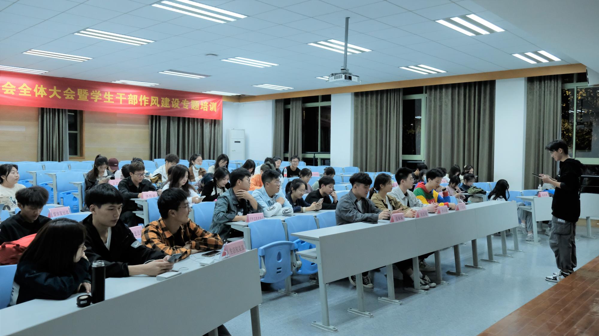 楼102教室展开,办公室负责人施彦昊同学主讲。他向大家介绍了小型会议会务工作流程,并对活动筹备的若干问题作出解答。结合不同会议的需要,他强调了会务前期准备工作、时间安排、会场布置及嘉宾席物品摆放的注意事项,为各部门今后开展会务工作理清了思路。