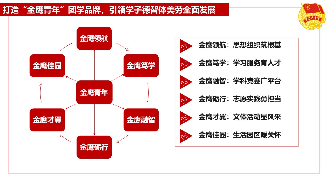 团委积极打造“金鹰青年”团学品牌,以“金鹰领航”“金鹰笃学”“金鹰融智”“金鹰砺行”“金鹰才翼”和“金鹰佳园”六大建设方向为载体,引领凝聚青年、组织动员青年、联系服务青年,引领青年学子德智体美劳全面发展。