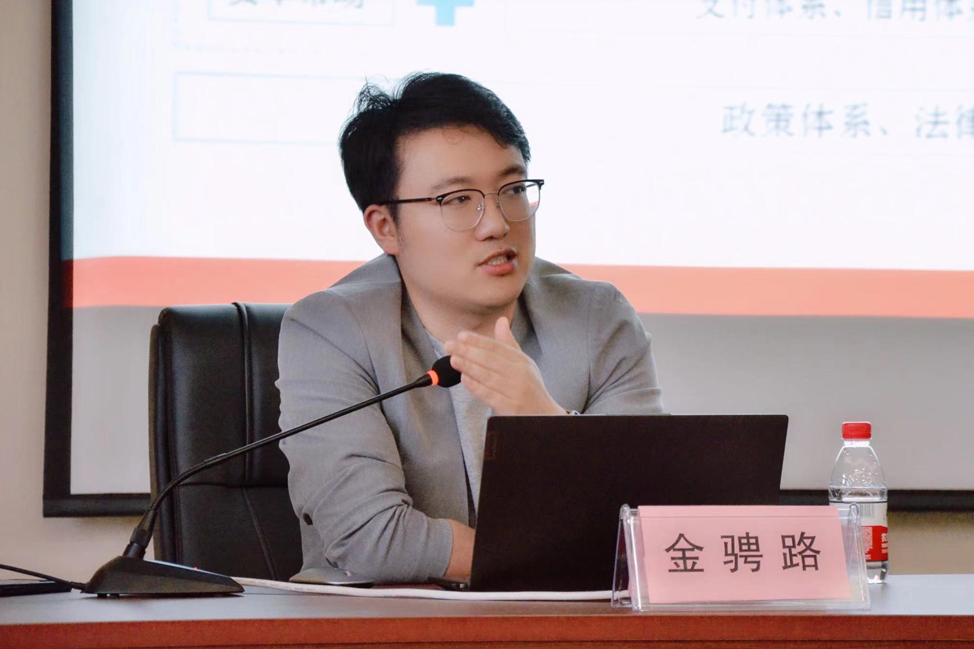 党委委员、金融系主任金骋路担任主讲人。讲座通过线上线下相结合的的方式举行,五百余名同学参加了讲座。