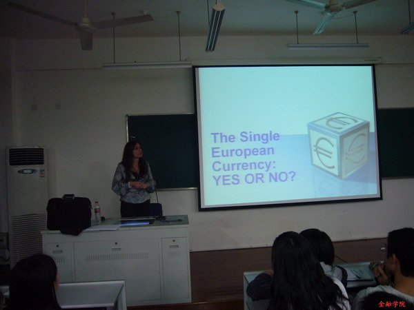 课上,Katerina老师用贴切的比喻和幽默的语言,为同学们分析了伦敦的经济体制,并用详细的图片和数据解释了欧盟的构造及加入欧盟的利弊,赢得了在场同学的热烈掌声。