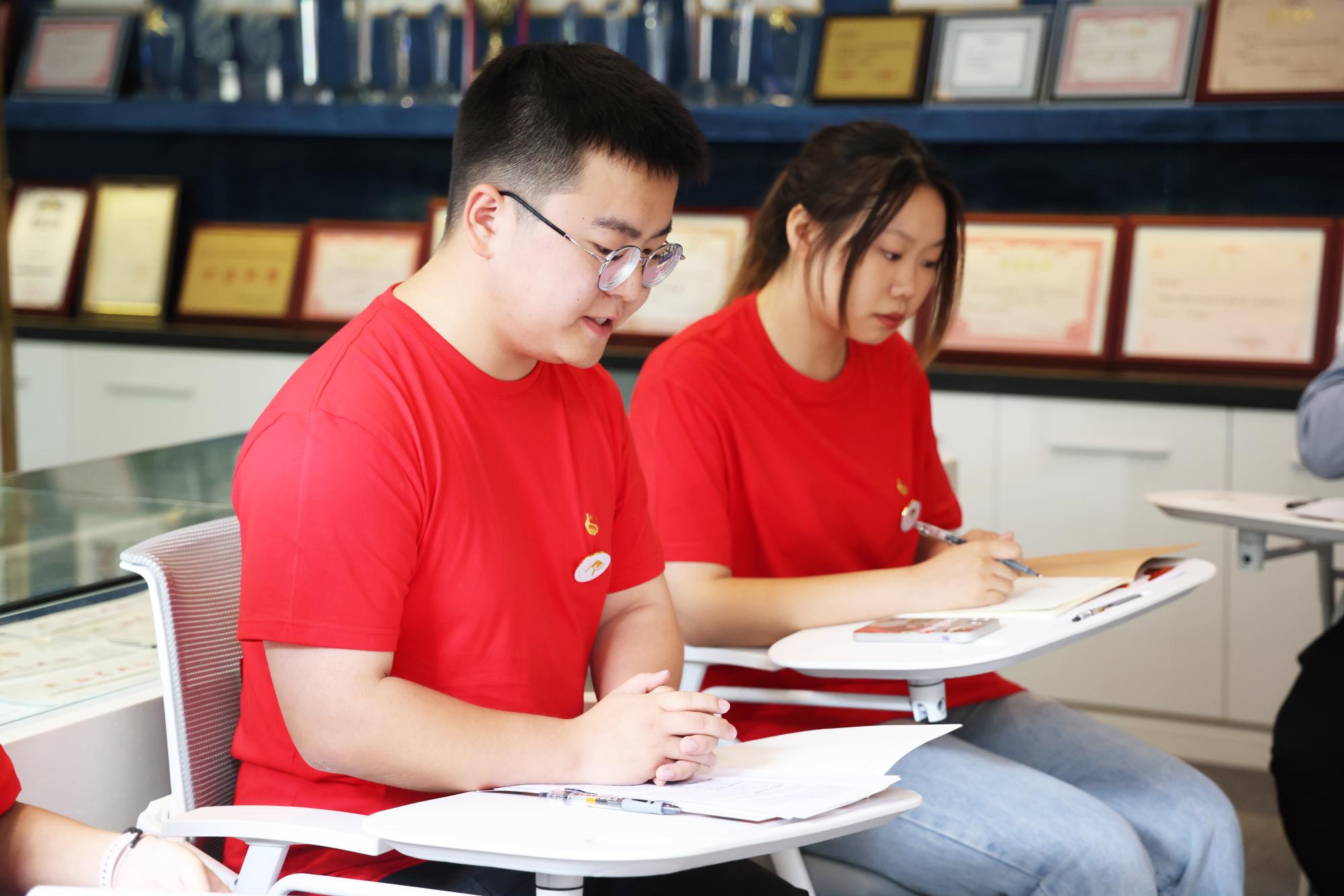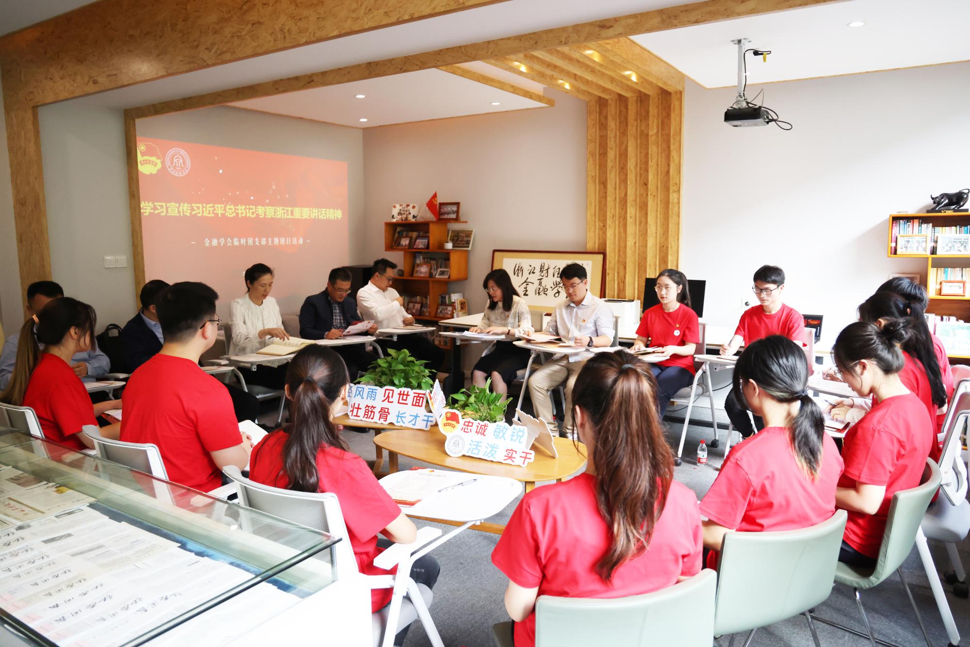 随后,学会临时团支部开展了“学习习近平总书记考察浙江重要讲话精神”主题团日活动, 临时团支部书记周逸凡领学,与会同学结合自身实际,围绕“一个村”“一座城”“一个馆”“一座园”分享感悟。来自义乌的王竟逸同学说“作为义乌的一份子,我在大学不断提升自我,希望未来反哺我热爱的义乌。”来自温岭的许瑾说“温岭人民也是凭借着持之以恒的努力与坚韧,创造出了一条崭新的发展道路。我也会继续发扬祖辈、父辈的艰苦创业精神。”学会副会长郭宇芯谈到将“枫桥经验”的智慧运用到学会日常管理运行中,自己也收获颇丰。副会长张芮晗结合自己观看亚运会开幕式的体验,谈到大学生要树立文化自信,学会分析、辨别外来文化。会员管理部的王申毅说“作为一名金融专业的青年学生,希望能够运用所学金融知识助力现代化浙江建设。”