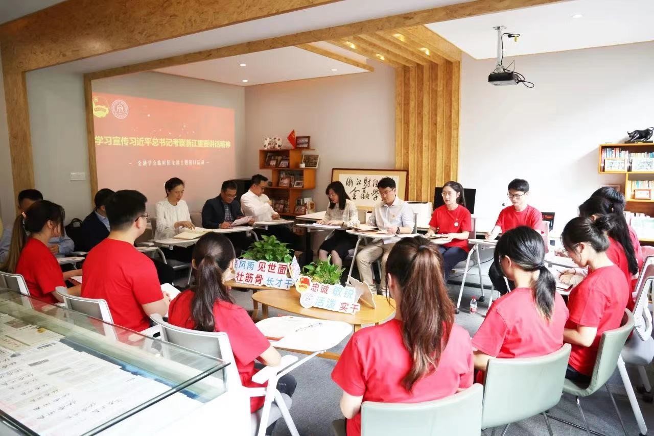 随后,学会临时团支部开展了“学习习近平总书记考察浙江重要讲话精神”主题团日活动, 临时团支部书记周逸凡领学,与会同学结合自身实际,围绕“一个村”“一座城”“一个馆”“一座园”分享感悟。来自义乌的王竟逸同学说“作为义乌的一份子,我在大学不断提升自我,希望未来反哺我热爱的义乌。”来自温岭的许瑾说“温岭人民也是凭借着持之以恒的努力与坚韧,创造出了一条崭新的发展道路。我也会继续发扬祖辈、父辈的艰苦创业精神。”学会副会长郭宇芯谈到将“枫桥经验”的智慧运用到学会日常管理运行中,自己也收获颇丰。副会长张芮晗结合自己观看亚运会开幕式的体验,谈到大学生要树立文化自信,学会分析、辨别外来文化。会员管理部的王申毅说“作为一名金融专业的青年学生,希望能够运用所学金融知识助力现代化浙江建设。”