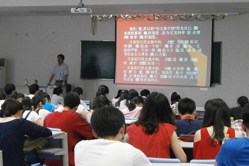 杨书记对于党的原则、纪律、作风有准确而清晰的把握。在课上,杨书记用生动的事例、详实的资料与严谨的思路,让同学们对党的原则、纪律、作风有了一个全面、细致的了解。他首先介绍了民主集中制是党的基本原则。中国共产党是按照自己的纲领和章程,在马克思主义指导下,按照民主集中制组织起来的统一整体。民主集中制是党的根本组织原则,是群众路线在党的生活中的实际运用。实行民主集中制原则,就要努力造就又有集中又有民主、又有纪律又有自由、又有统一意志又有个人心情舒畅、生动活泼的政治局面。而党的纪律,就是按照党的政治纲领和民主集中制原则,根据革命和建设需要而确立的党的各级组织和全体党员必须遵守的行为规范。党员和积极分子们同时还要坚持解放思想、实事求是,坚持和发展党的优良传统和作风。杨书记讲述细致、清晰,同学们认真记下了每一个要点,课堂气氛严肃认真而又不失活力。