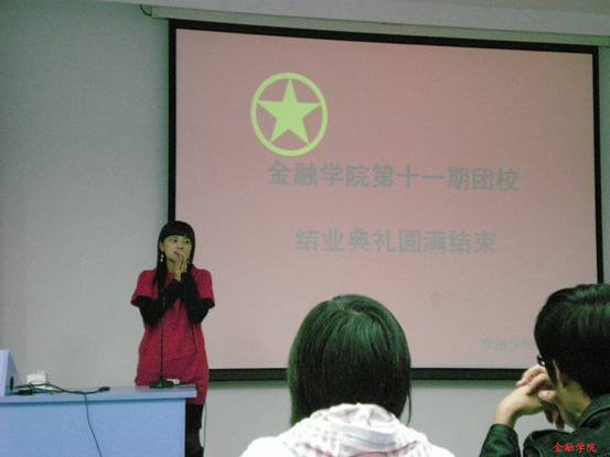 政治辅导员及分团委指导老师王文婷、分团委副书记吴晗旭学长出席本次结业典礼。结业典礼以全场同学歌唱中华人民共和国国歌开始,接着吴晗旭学长做团课总结报告,之后是同学浅谈感想,分发结业证书,优秀团员领取证书,最后,王老师对本次团校培训班的相关事宜提了几点建议。