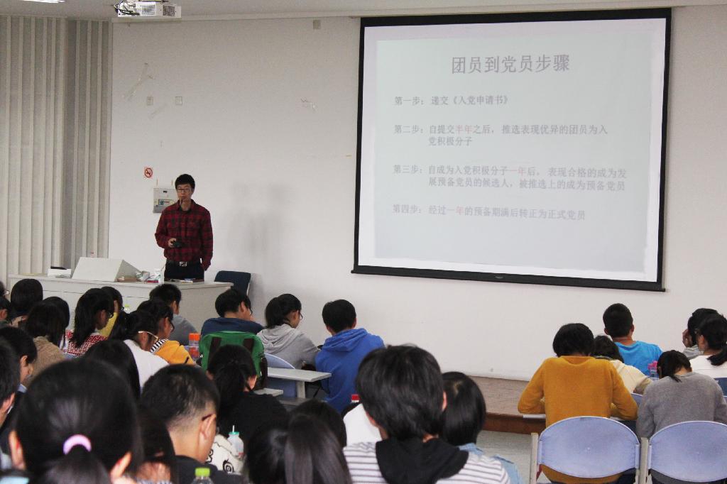 本次讲座,蒋超老师分别从共青团发展历史、团员到党员的具体步骤及要求,以及作为大一新生如何过好大学四年生活三方面一一做了介绍。