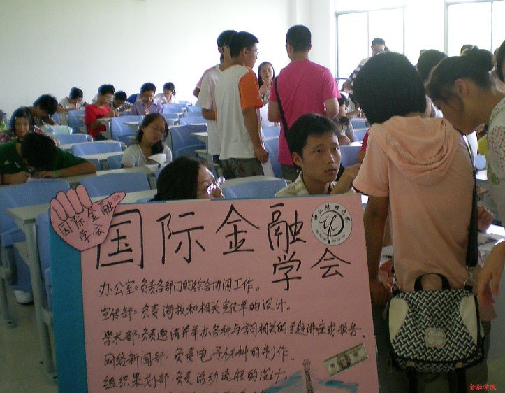 众多学术性社团也先后积极开展了各自的招新活动。金融学会、公司金融学会、国际金融学会、邓小平理论研究会、保险学会、信用管理学会,每一个学会都各具特色,吸收引进众多优秀人才。