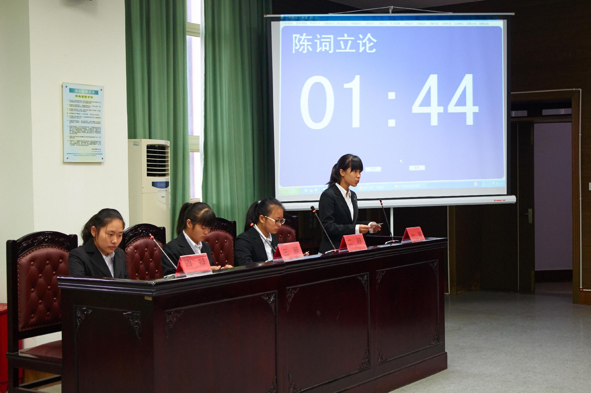 模拟法庭隆重开赛。本次辩论赛的辩题是“横刀夺爱是对还是错”,正方由13金融2班的四位女生组成,反方辩手则来自13金融1班。