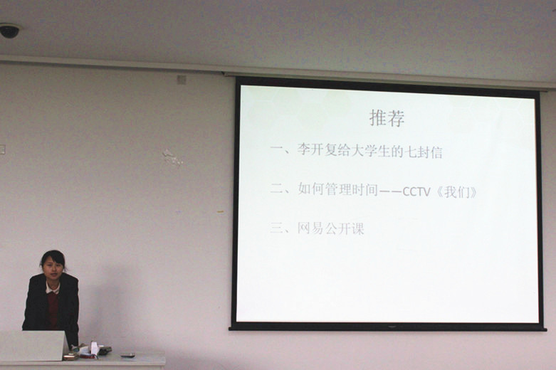 吴轶韵老师就“新生如何适应大学生活”的主题与同学们分享了大学生活的种种,并且对此提出了自己的见解。她从老师、朋友和“过来人”的角度对同学们如何丰富自己的大学生活并且为以后的就业打下良好的基础提出了建议。随后,吴轶韵老师又和同学们分享了一段李开复的演讲视频,同学们纷纷表示受益良多。