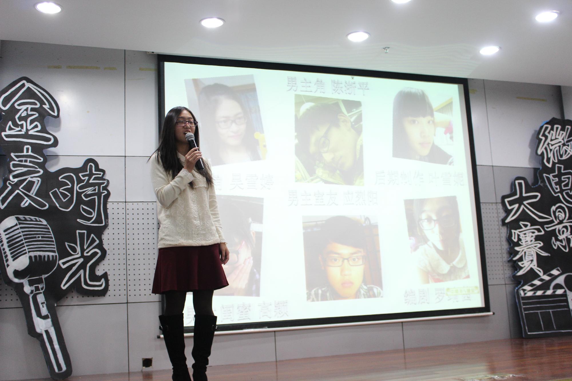 学生会主席汤洁、副主席苏婷、宣传部副部长马诗怡、12级微电影大赛最佳男主角林开源及十位大众评委。