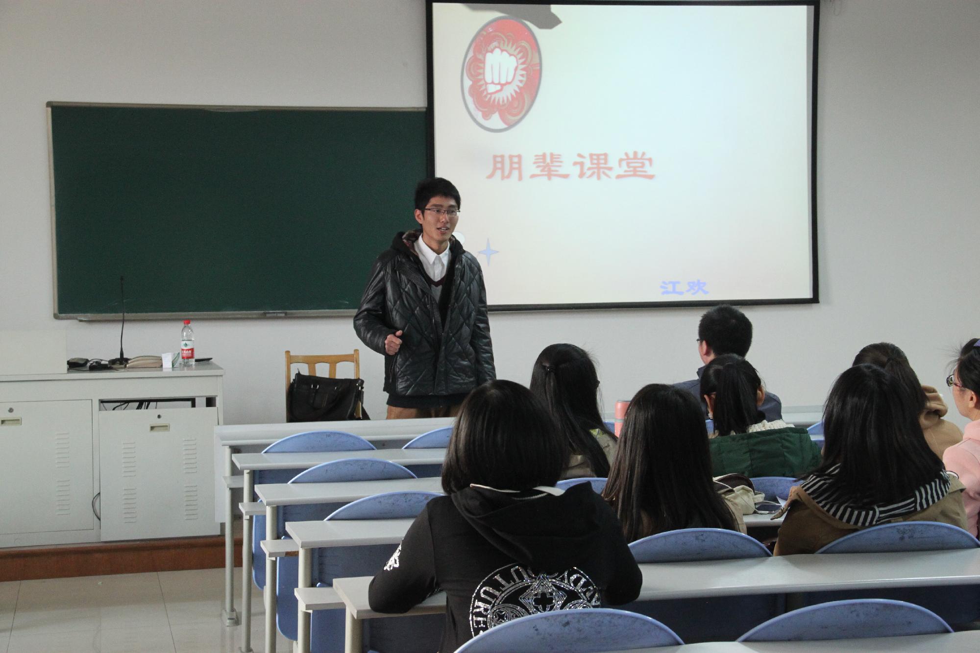 朋辈课堂第二讲在C301顺利举行,本次朋辈课堂的主讲人为校学生会外联部部长江欢,他围绕自己在学生会的心路历程,以自身实际为例给我们讲解了他所认为的大学生在大学期间应该做到的五件事,让在座同学都若有所思。
