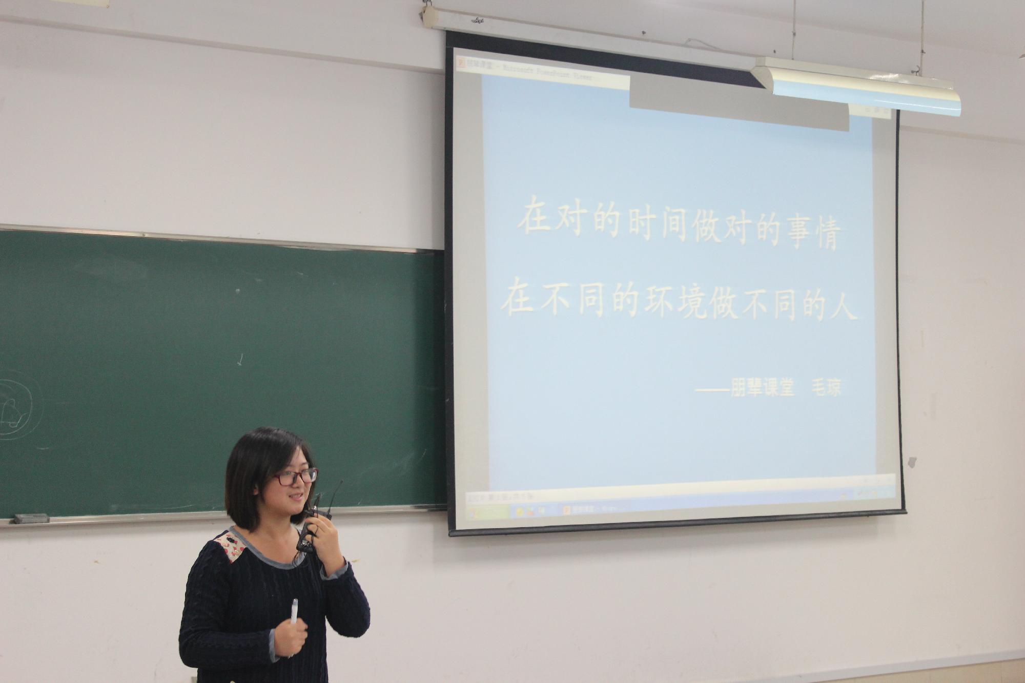 随后,毛琼重点和同学们分享了一些面试经验,不论是实习面试时要注意的要点,还是对个人未来面试时的规划,她都有针对性地加以解答。不止如此,她还总结出“职场菜鸟的生存法则”,谦卑地以一个“喽啰”的身份来谈论她所理解的“一个喽啰的自我修养”。虽然在座的同学还没有面临实习和面试的困扰,但是毛琼风趣而又意义十足的演讲让他们对未来有了憧憬和规划,同时也感受到了来自未来的压力。