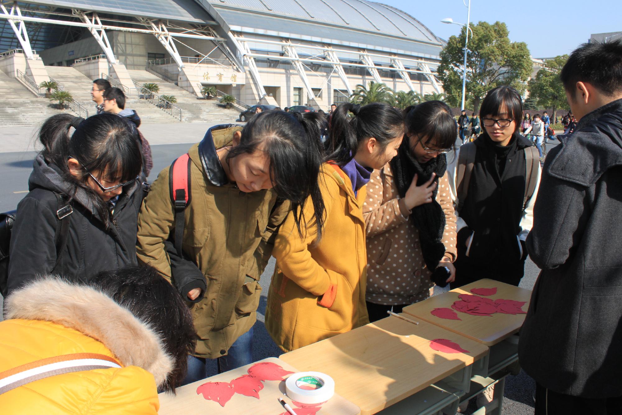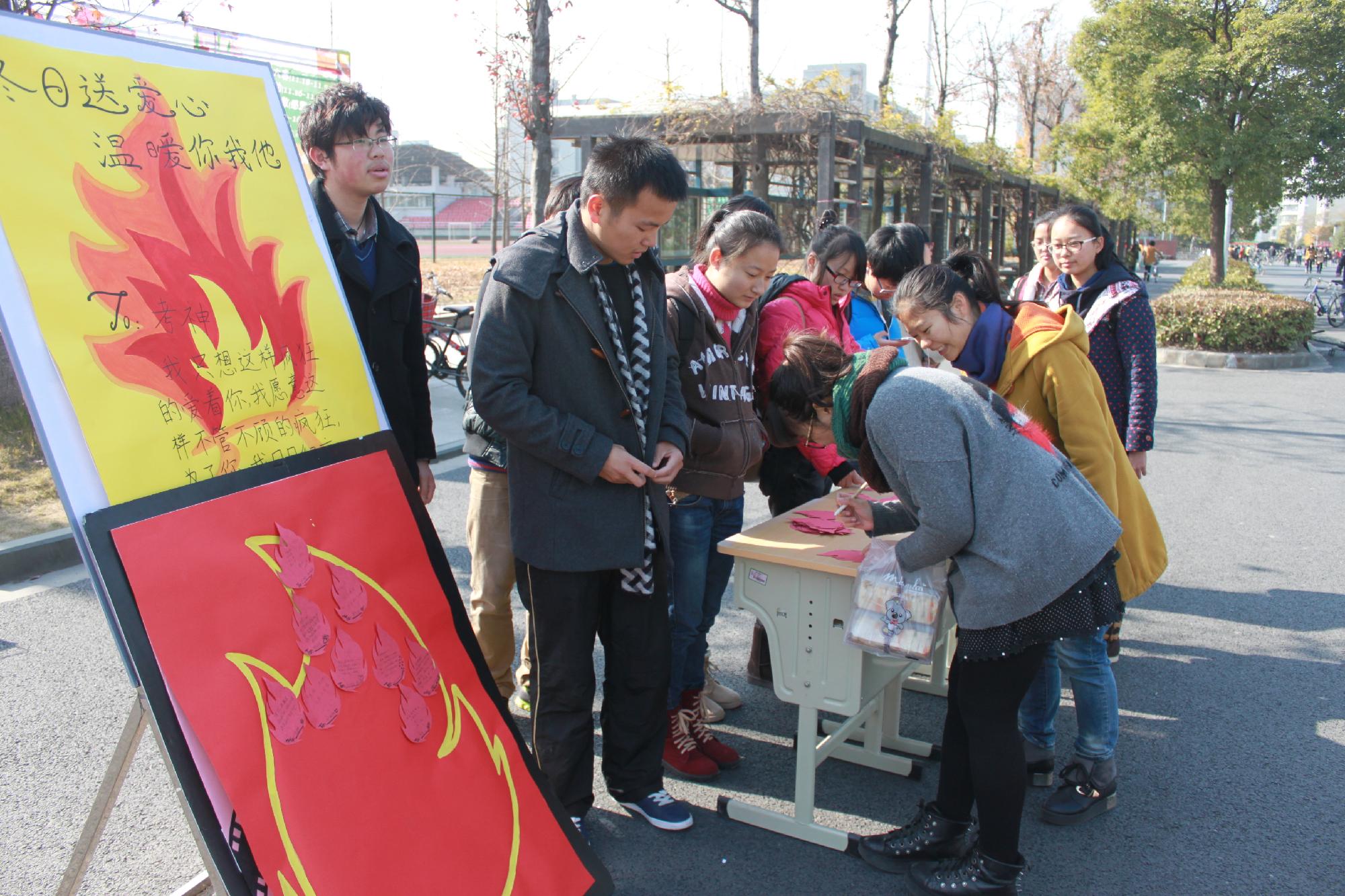 活动尚未开始,组织部成员早已摆好宣传海报和制作的卡片。伴随着下课的铃声,来往的人群越来越多,组织部的成员细心地向来往的同学介绍此次活动,并热情地展示自己制作的卡片。同学们纷纷被精美的海报以及精致的卡片所吸引,上前询问。组织部成员的真诚用心深深地打动了同学们,一张张火红的“火焰”卡片也让同学们爱不释手。同学们慷慨解囊,纷纷捐出饱含了爱心的一元钱,随后,同学们还带着最真挚的心在卡片上写下了对朋友的祝福、对未来的期许以及对生活的向往。活动现场人头攒动,气氛高涨,前来献爱心、送祝福的同学络绎不绝。