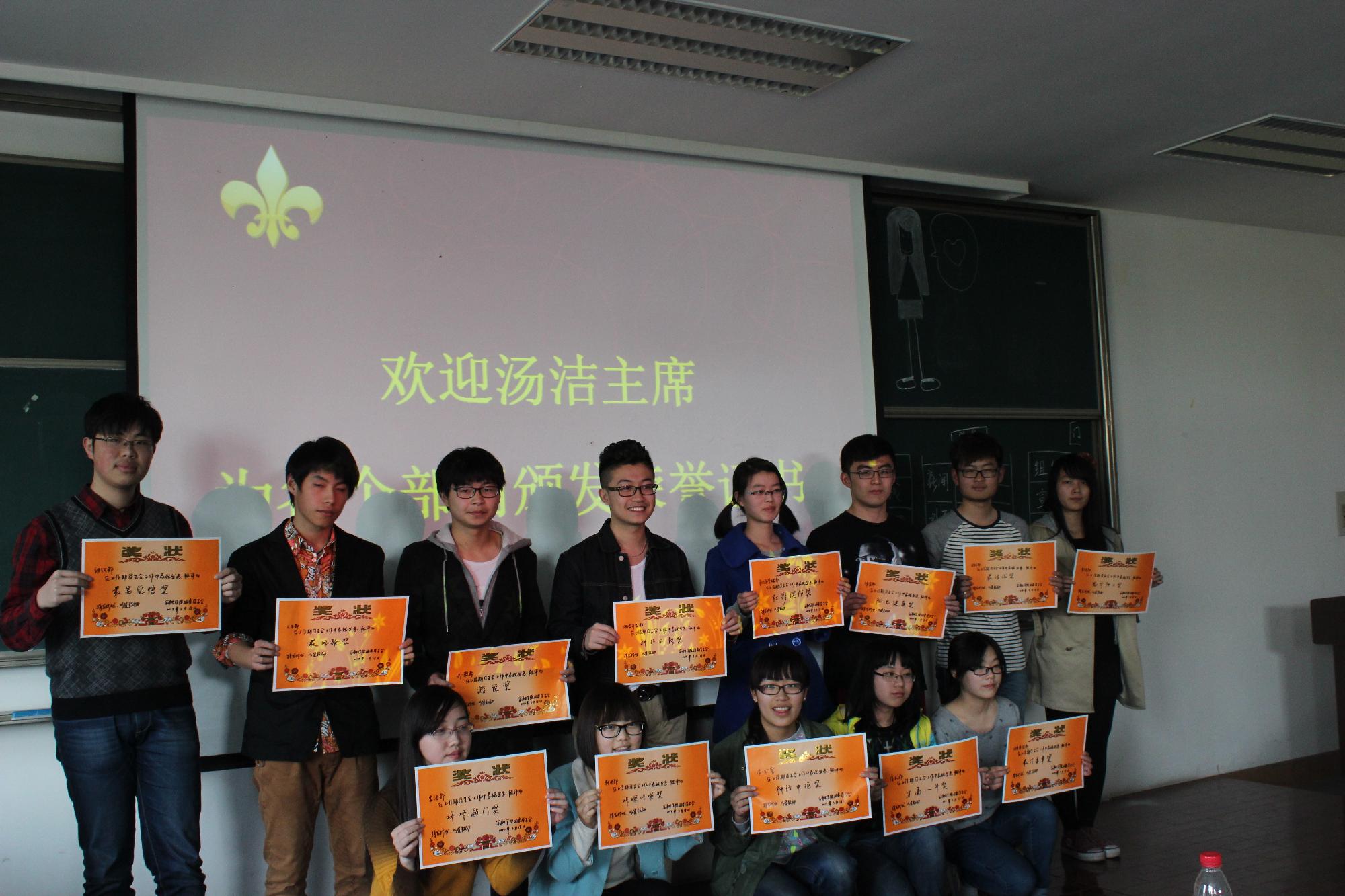 最后为各部门的颁奖活动将大会推向了高潮。经过一学期的努力学生会各个部门都在各自岗位上有了更好的发展,主持人随后宣布了各个部门获得的奖项并简单介绍了每个部门主要负责的事务:“中枢神经奖”——办公室、“鬼斧神工奖”——宣传部、“社彩缤纷奖”——社管部、“咔嚓咔嚓奖”——新闻部、“科技创新奖”——网络开发部、“最具风骚奖”——文艺部、“最有觉悟奖”——组织部、“最佳盖章奖”——分团委宣传部、“最具活泼奖”——实践部、“才高八斗奖”——学术部、“游说奖”——外联部、“咚咚敲门奖”——生活部、“阳光健康奖”——体育部。精彩幽默的颁奖词将大会气氛调动得轻松愉悦,学生会全员一片欢声笑语其乐融融。学生会主席汤洁为各部门代表颁发奖状并合影留念。