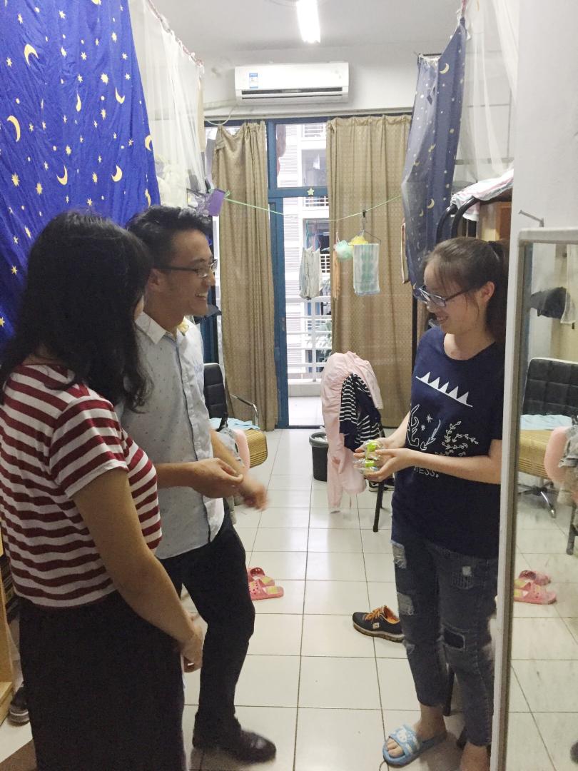 下午至晚上,辅导员们走访学生寝室,为同学们送去中秋问候。每逢佳节倍思亲,走访中,辅导员们细心询问了同学们的近况,为临近中秋、思念父母的同学们送去了如家一般的温暖。小小的宿舍里笑语不断,温情弥漫。