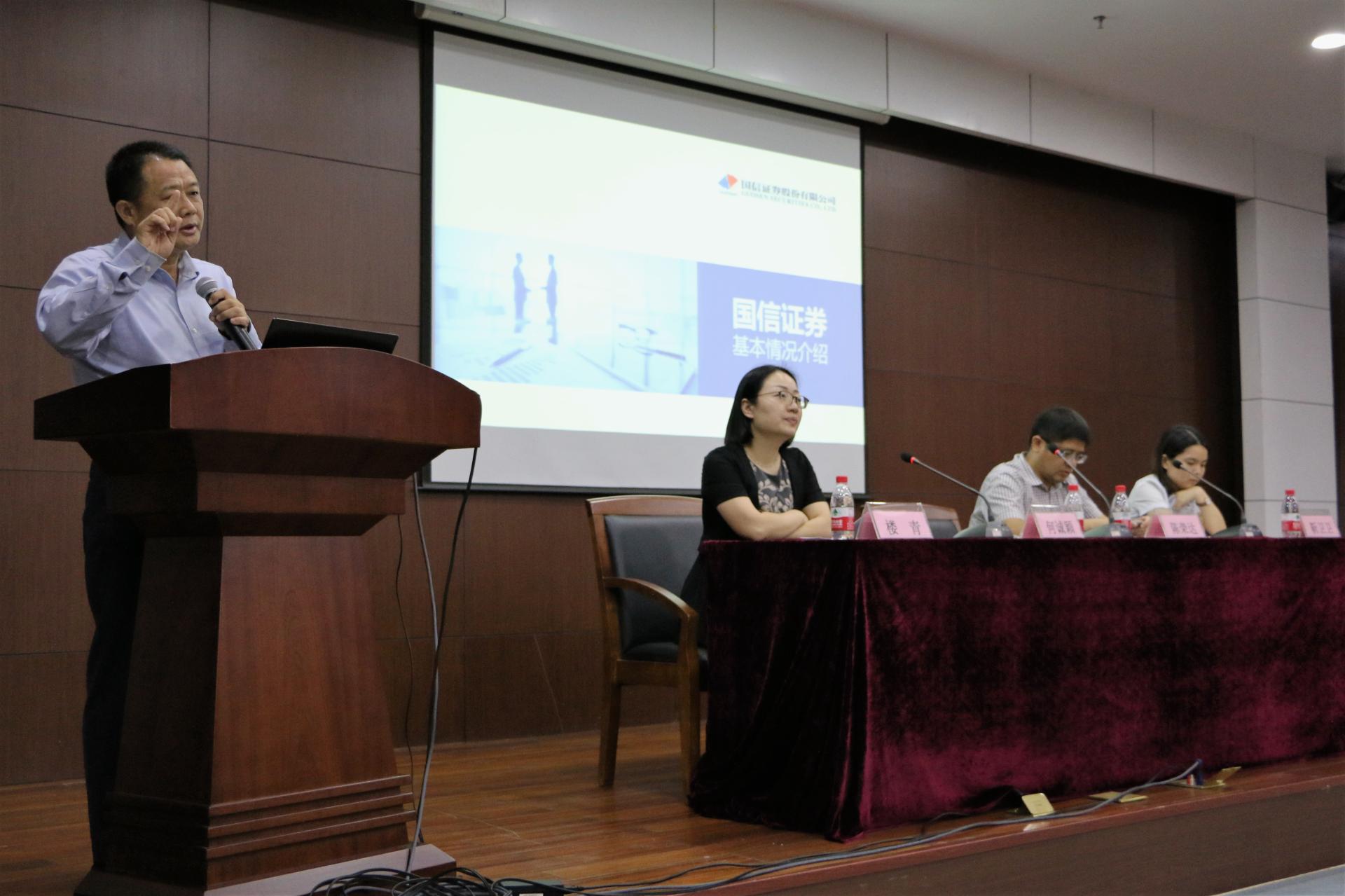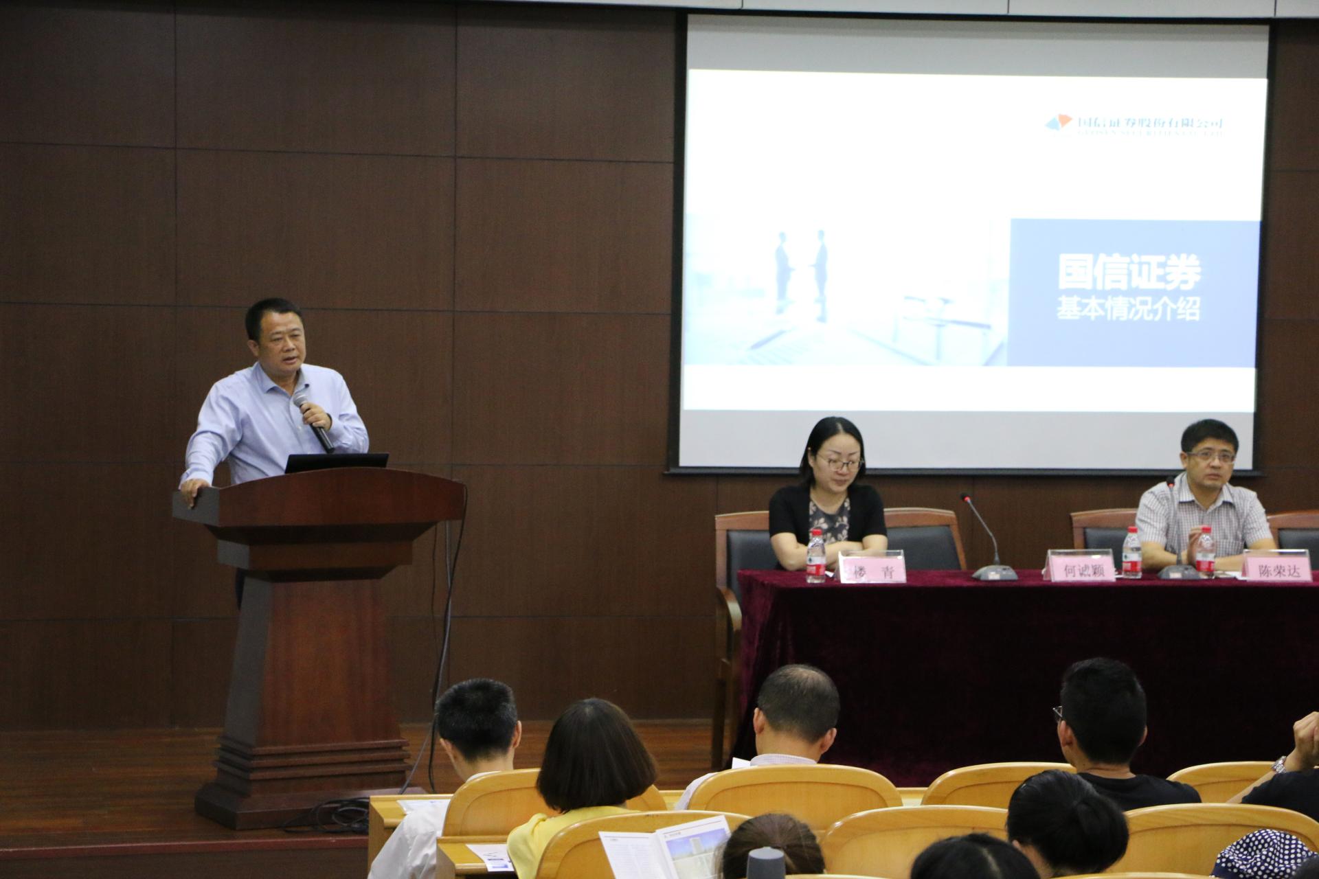 首先陈荣达院长发表致辞,对国信证券公司嘉宾的到来深表欢迎。接着何诚颖主席介绍了国信证券基本情况,他谈到国信证券作为全国性大型综合类证券公司,是证券行业的领军企业,在多年来取得了显著的成就,同时他强调了成为一名国信员工所应具有的学习与挑战的意识,让在场同学深受启发。楼青总经理介绍了国信证券第二分公司的发展史以及公司的现状和盈利状况,彰显了国信证券的文化和经营理念,表明公司一直坚持把客户放在首位,着力提升企业雇主的形象。最后由靳卫卫经理阐述了证券行业发展前景,解读了金融业和证券业热词,着重讲了公司招聘岗位的基本情况,并欢迎广大同学前去实习和工作。随后,嘉宾和同学们在现场进行了良好的问答互动。