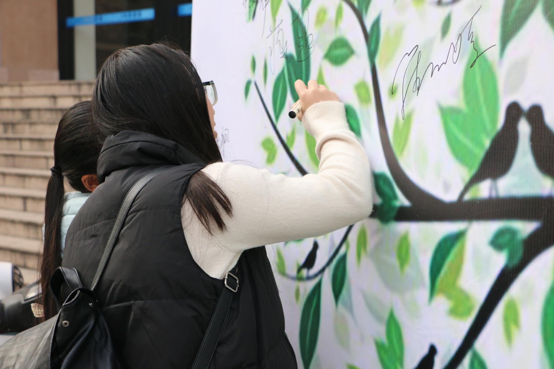 楼门口,在喷绘上签下名字,承诺必将遵守考纪,诚信应考,考出风采。